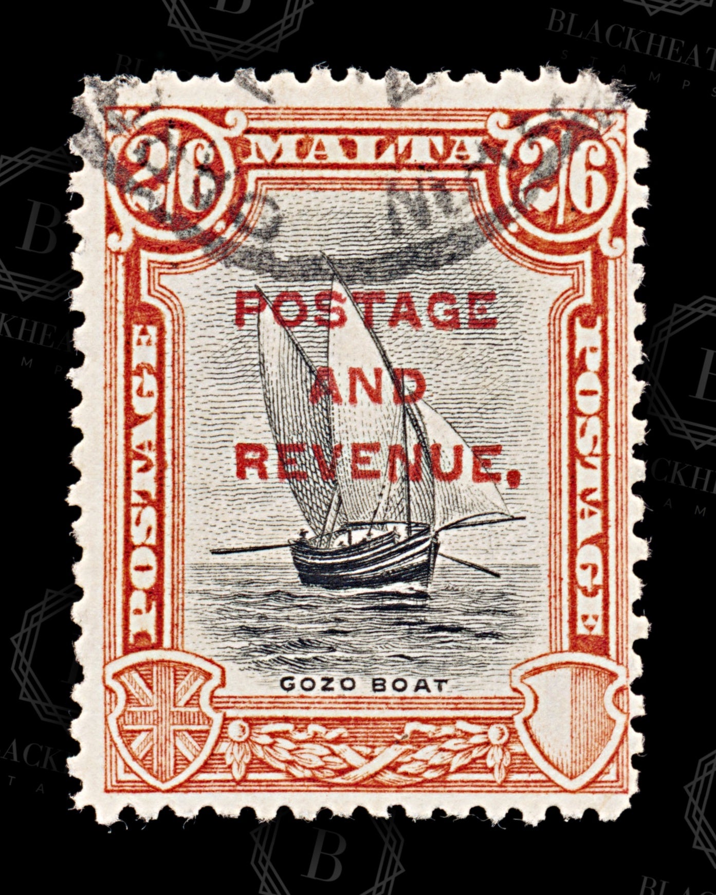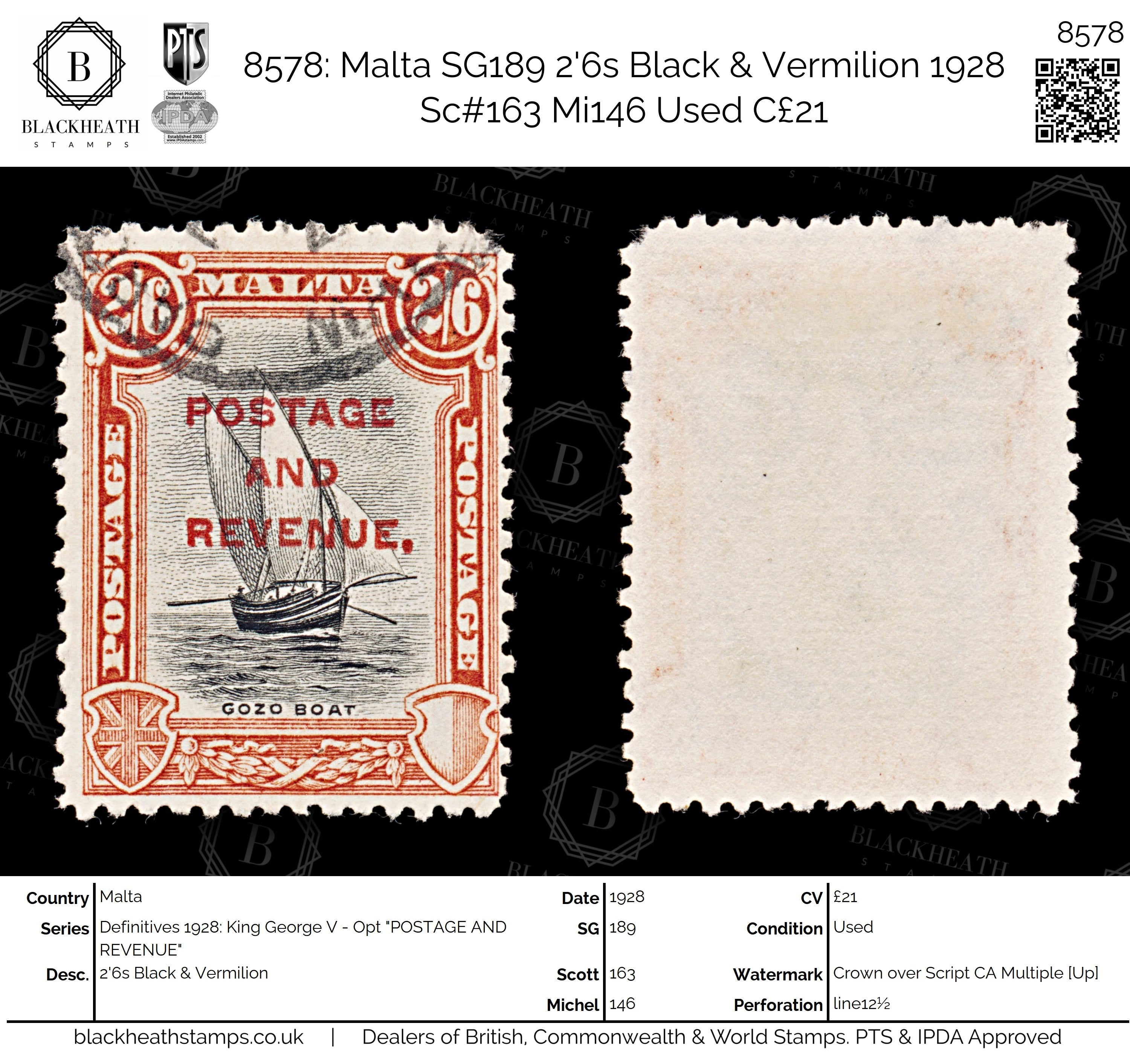 8578: Malta SG189 2'6s Black & Vermilion 1928 Sc#163 Mi146 Uséd C£21
