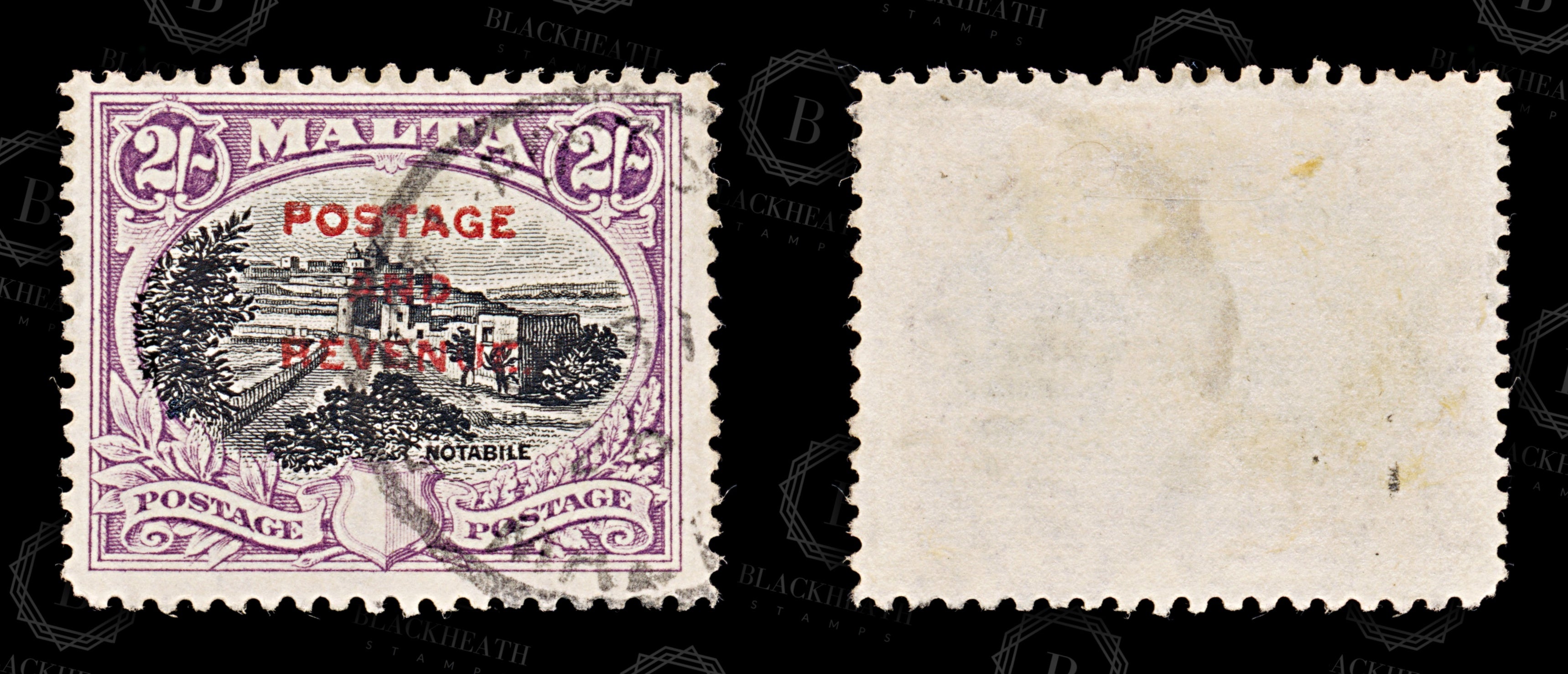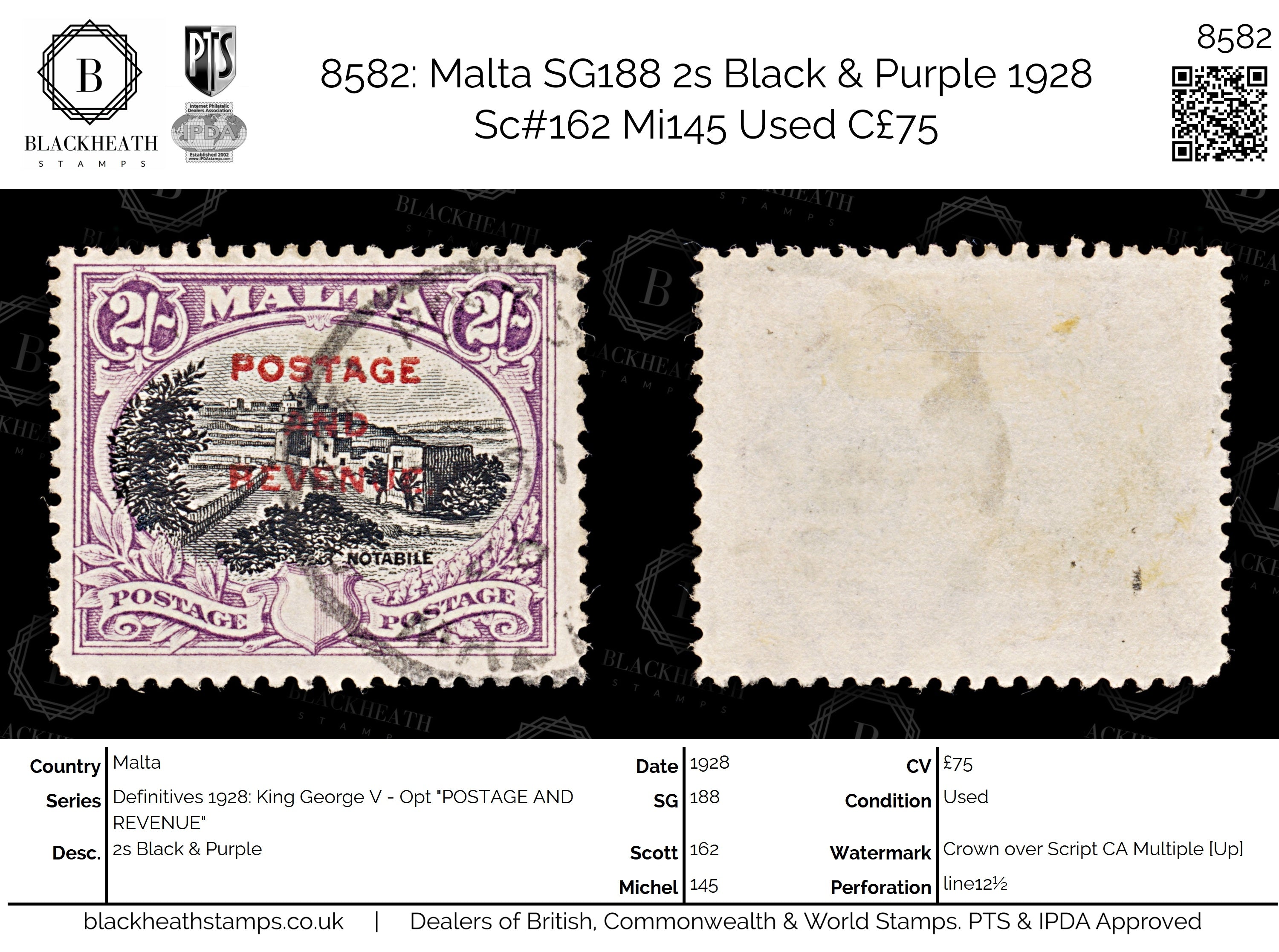 8582: Malta SG188 2s Black & Purple 1928 Sc#162 Mi145 Used C£75