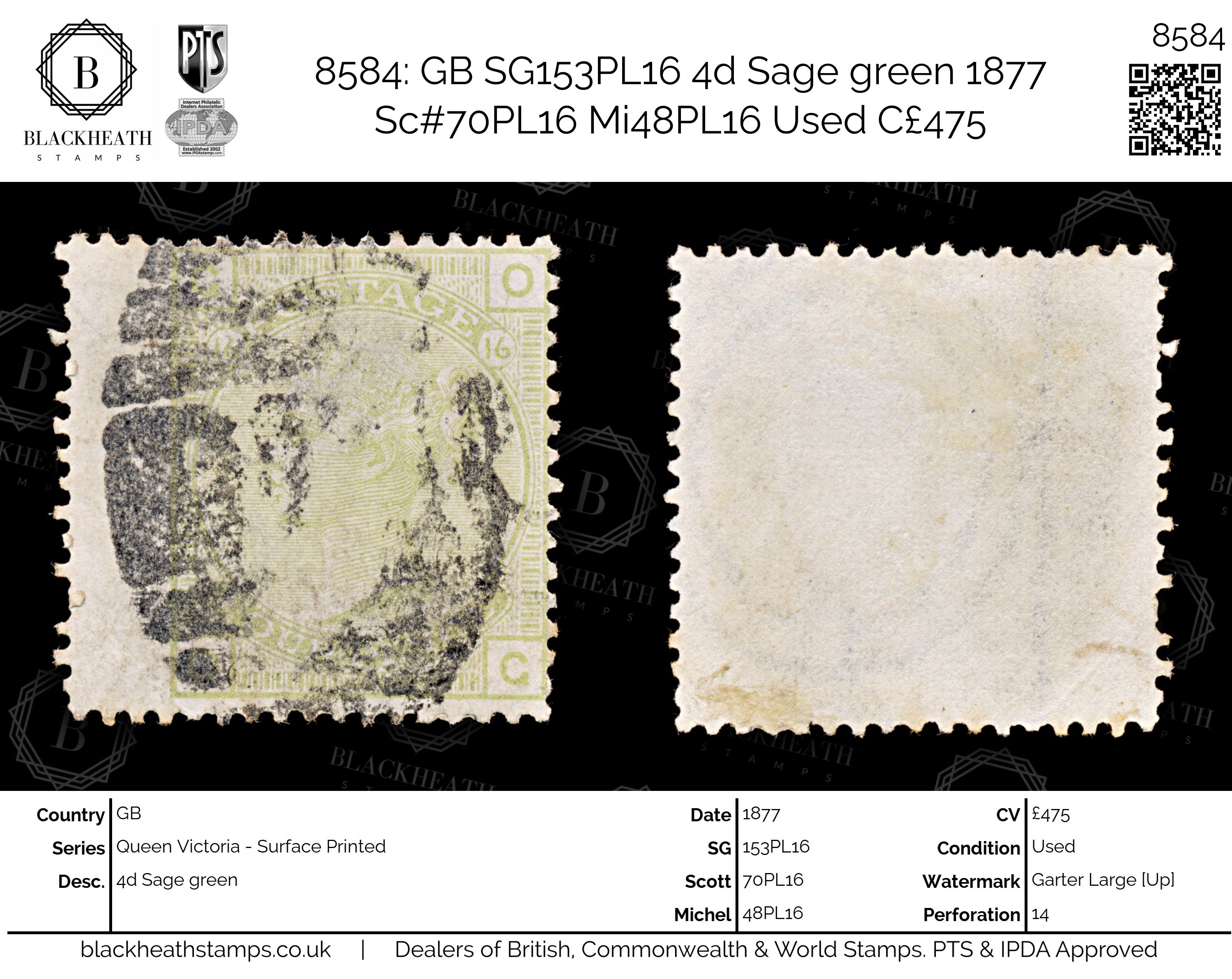 8584: GB SG153PL16 4d Sage green 1877 Sc#70PL16 Mi48PL16 Used C£475