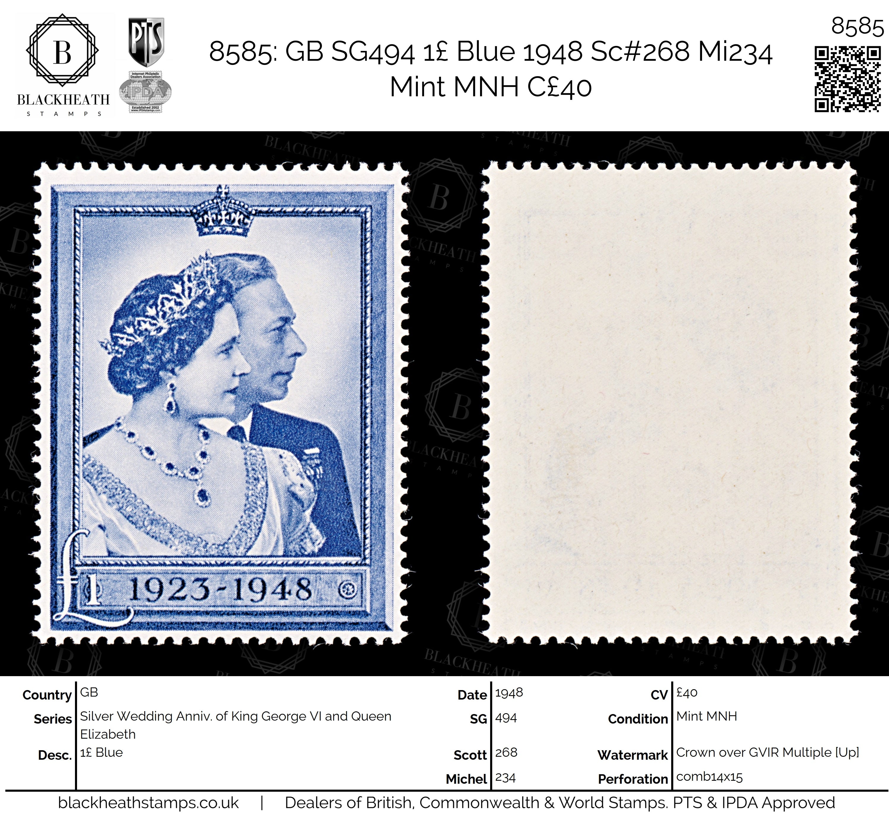 8585: GB SG494 1£ Blue 1948 Sc#268 Mi234 Mint MNH C£40
