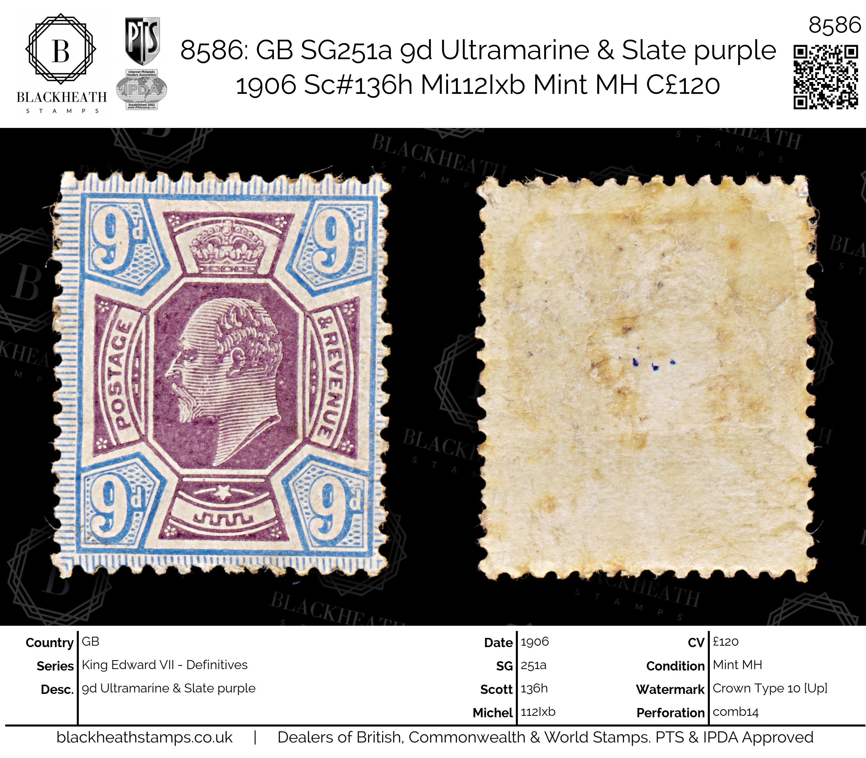 8586: GB SG251a 9d Ultramarine & Slate purple 1906 Sc#136h Mi112Ixb Mint MH C£120