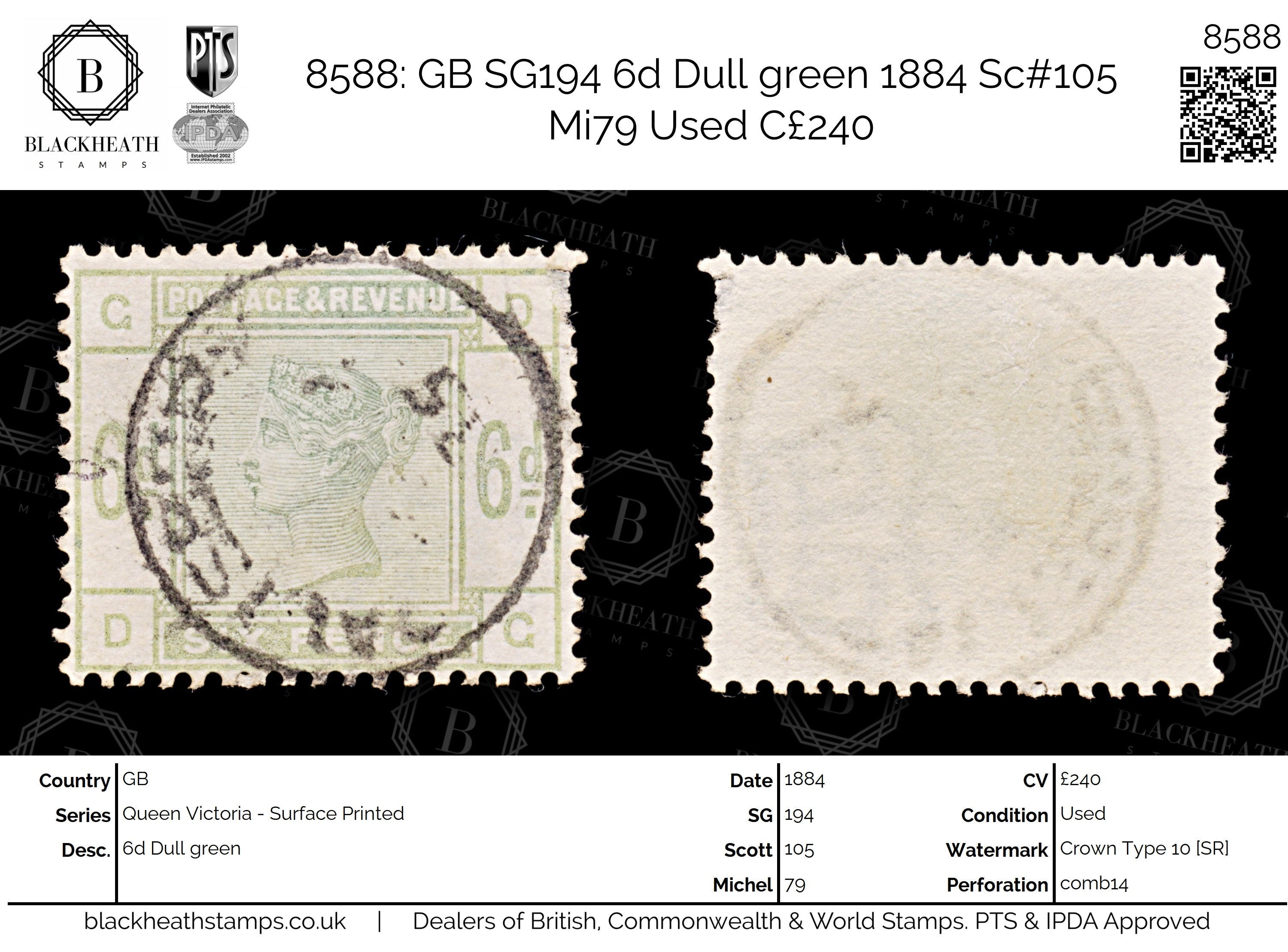 8588: GB SG194 6d Dull green 1884 Sc#105 Mi79 Uséd C£240