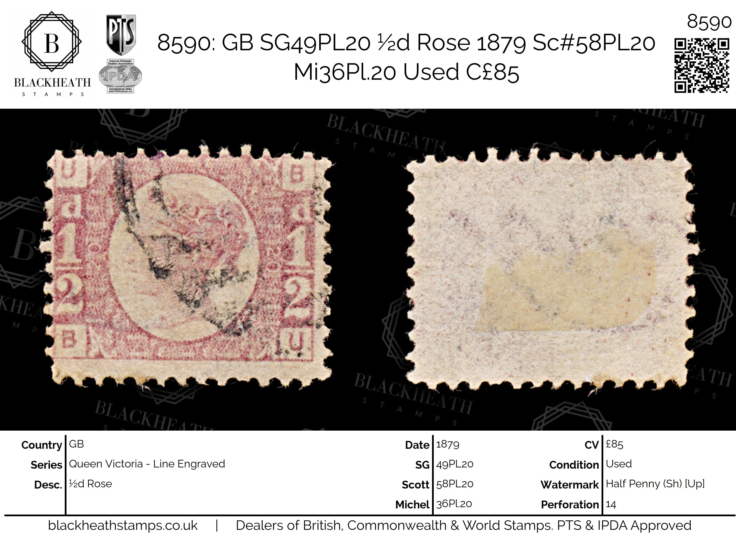 8590: GB SG49PL20 ½d Rose 1879 Sc#58PL20 Mi36Pl.20 Uséd C£85