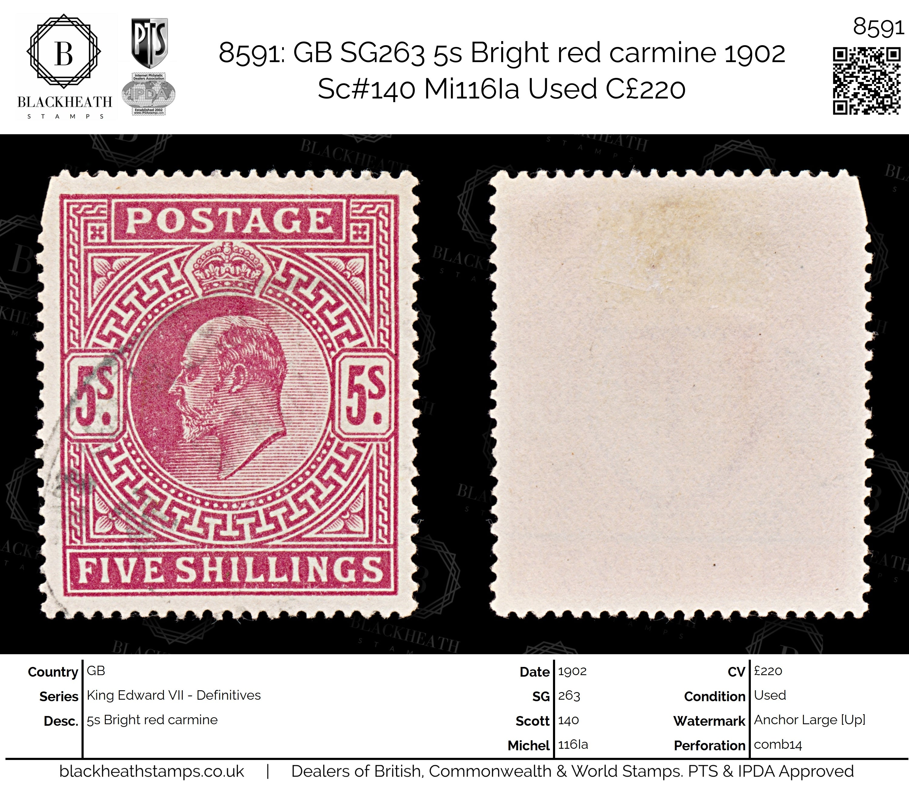 8591: GB SG263 5s Bright red carmine 1902 Sc#140 Mi116Ia Uséd C£220