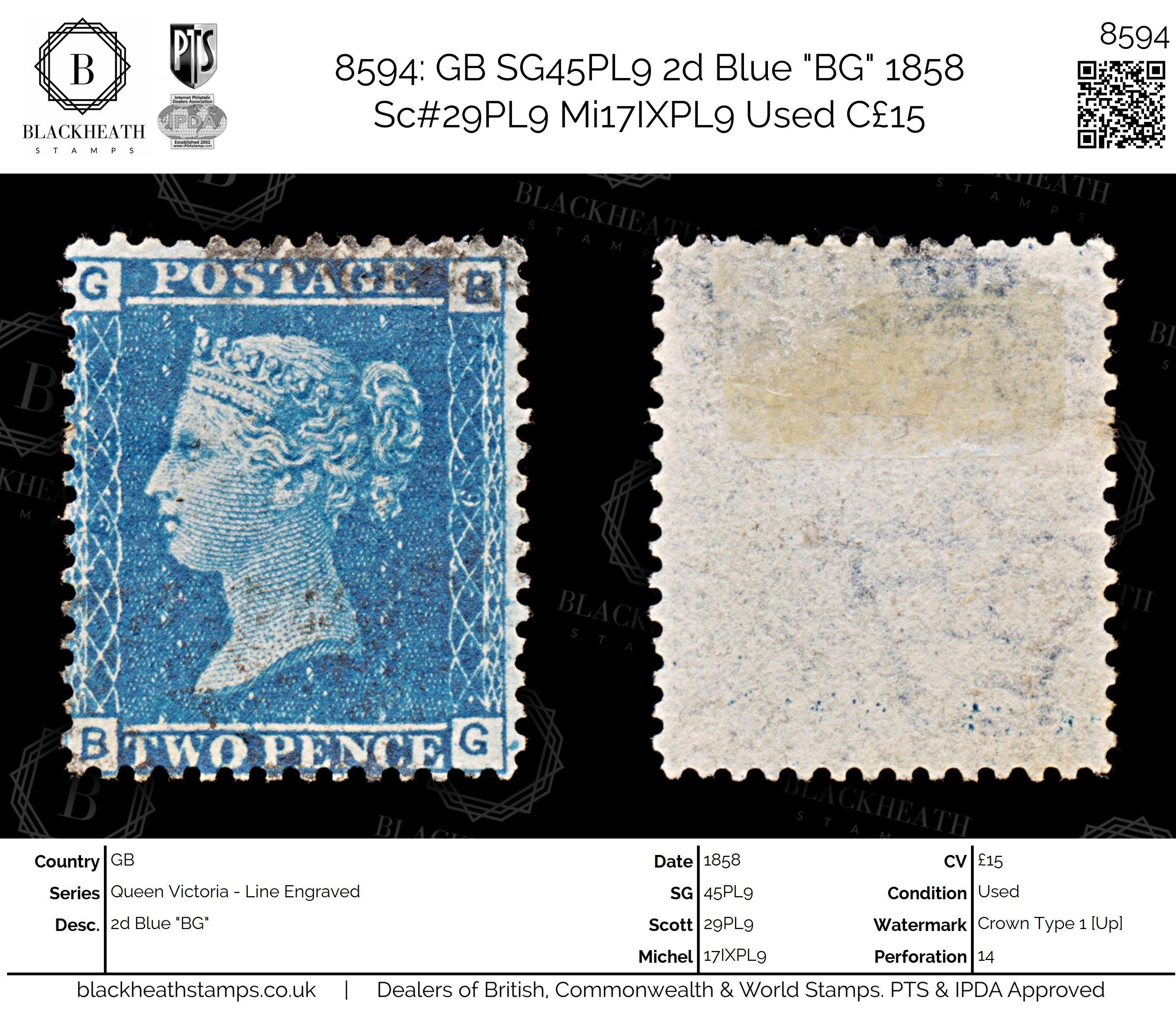 8594: GB SG45PL9 2d Blue "BG" 1858 Sc#29PL9 Mi17IXPL9 Used C£15