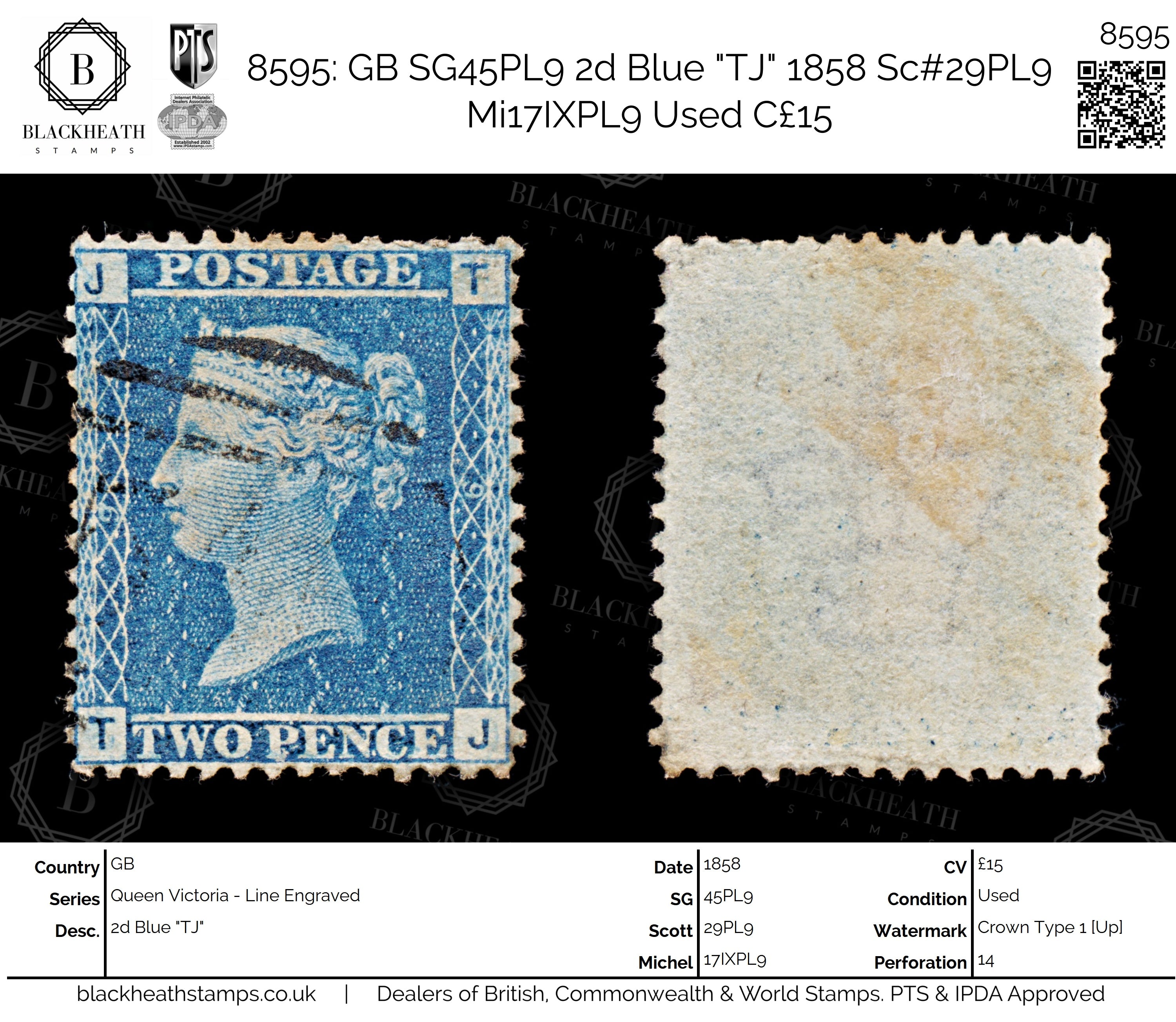 8595: GB SG45PL9 2d Blue "TJ" 1858 Sc#29PL9 Mi17IXPL9 Uséd C£15