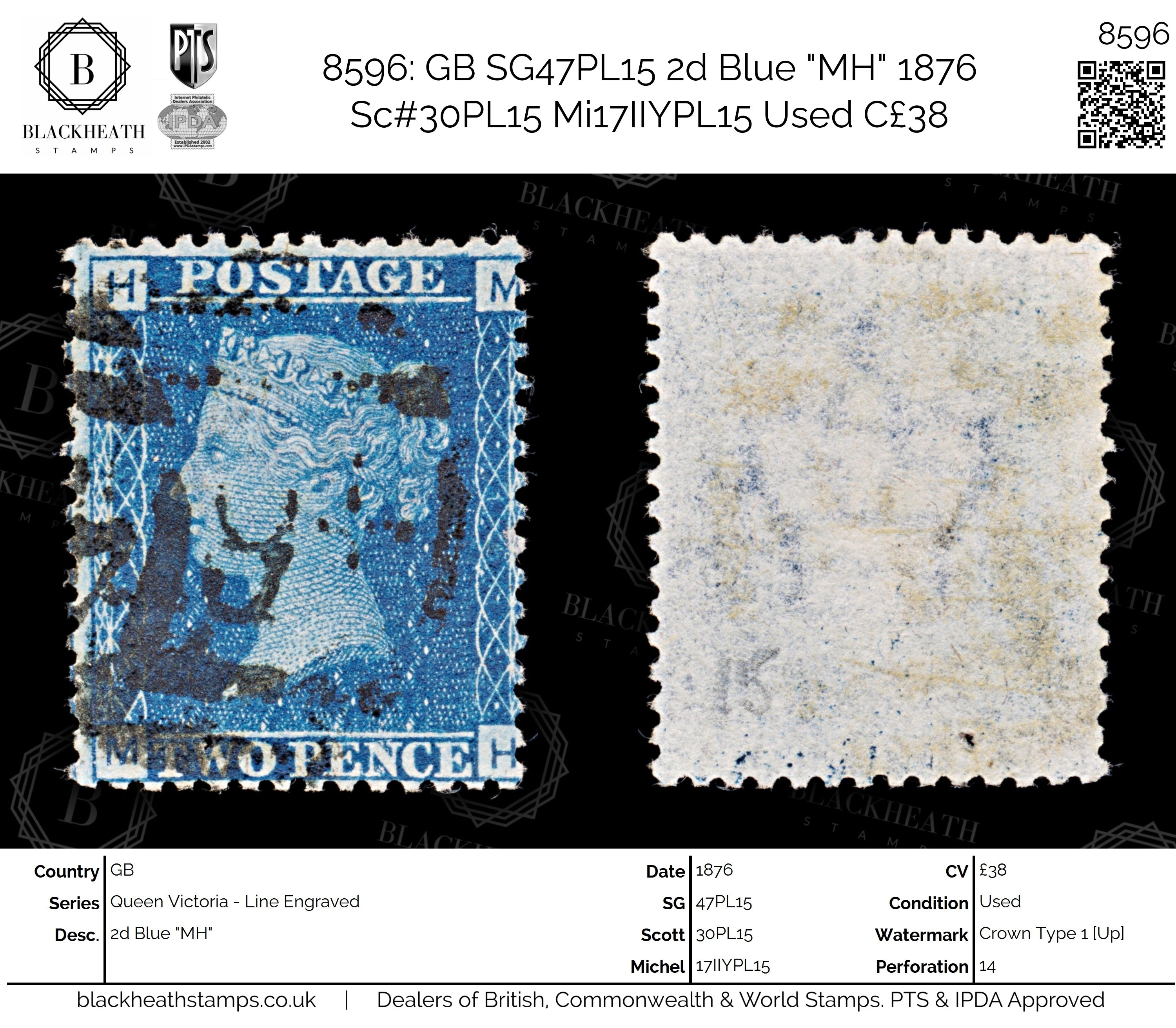 8596: GB SG47PL15 2d Blue "MH" 1876 Sc#30PL15 Mi17IIYPL15 Uséd C£38