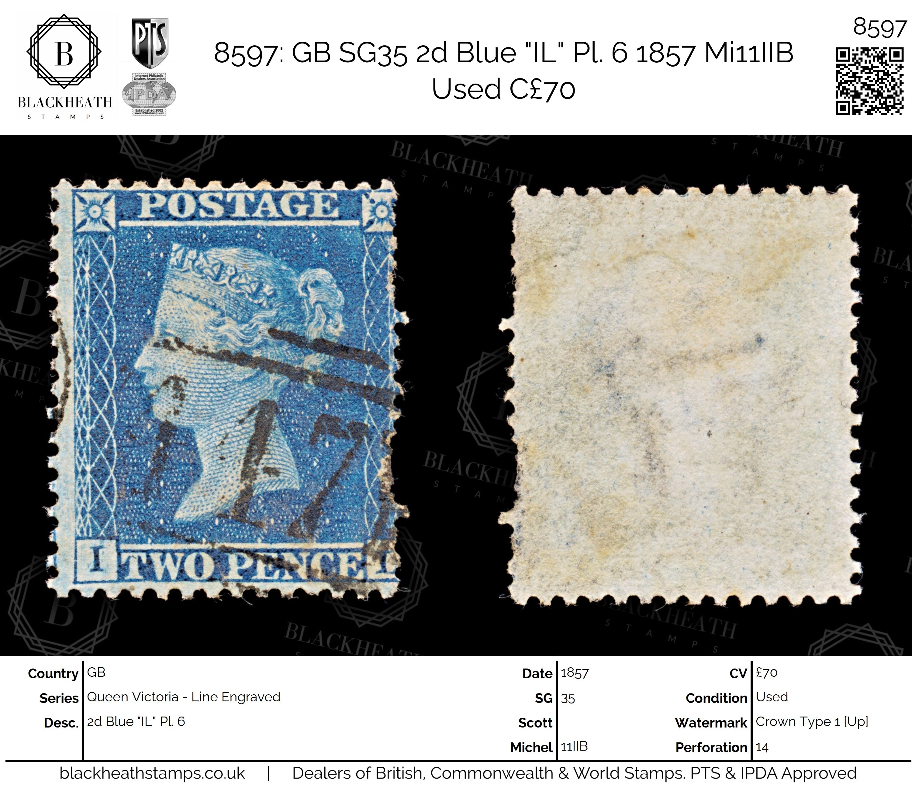 8597: GB SG35 2d Blue "IL" Pl. 6 1857 Mi11IIB Used C£70