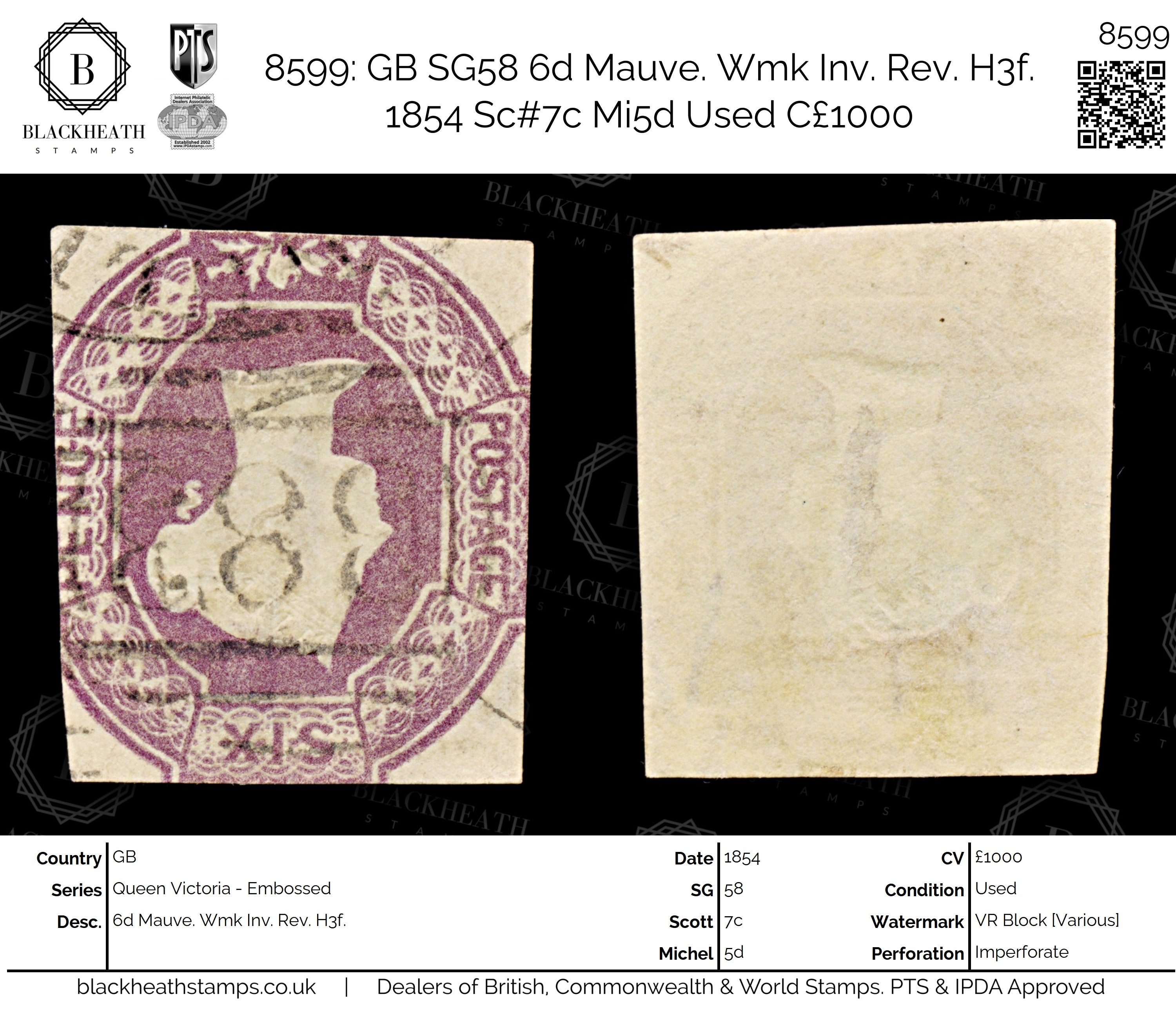8599: GB SG58 6d Mauve. Wmk Inv. Rev. H3f. 1854 Sc#7c Mi5d Uséd C£1000