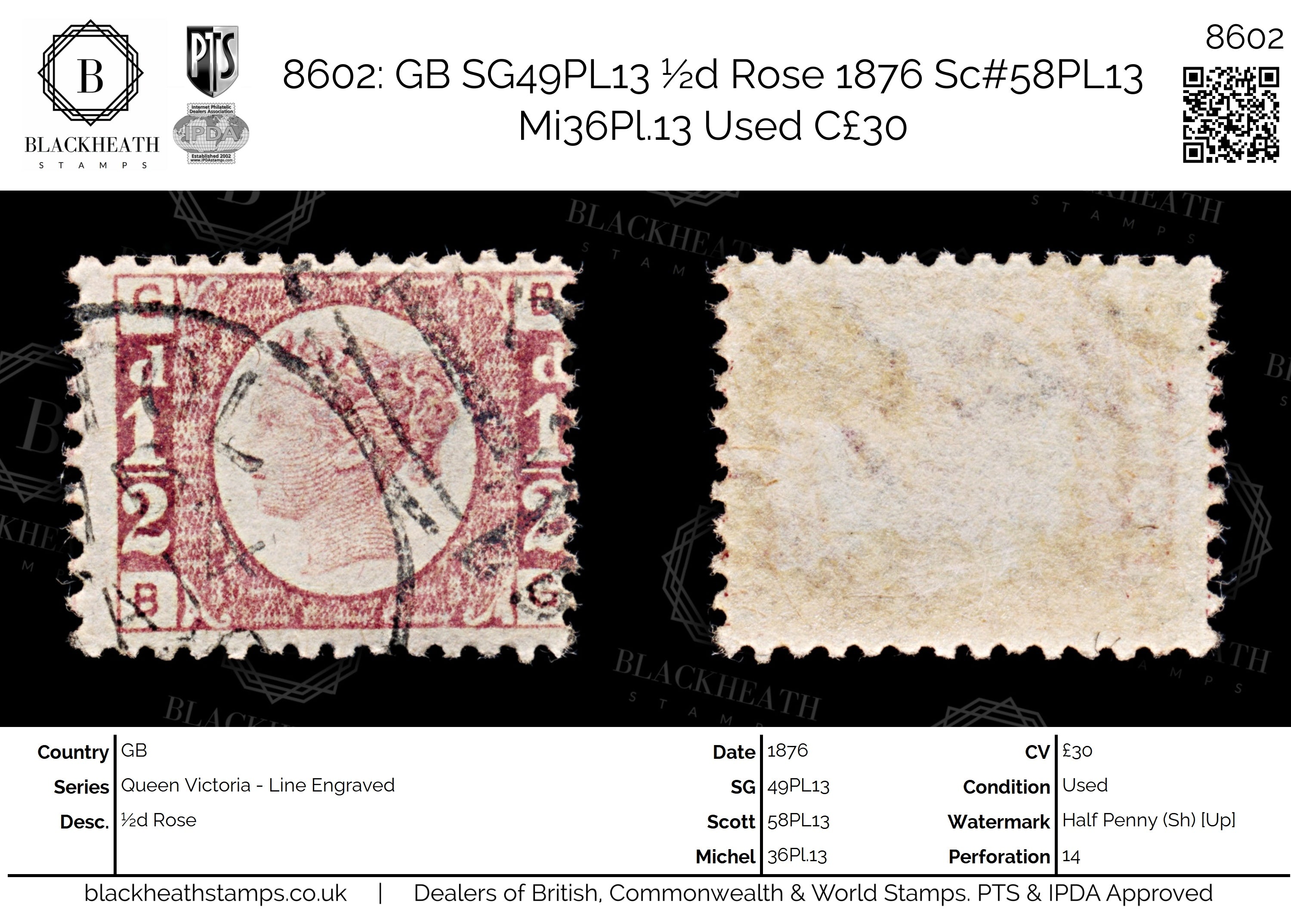8602: GB SG49PL13 ½d Rose 1876 Sc#58PL13 Mi36Pl.13 Uséd C£30