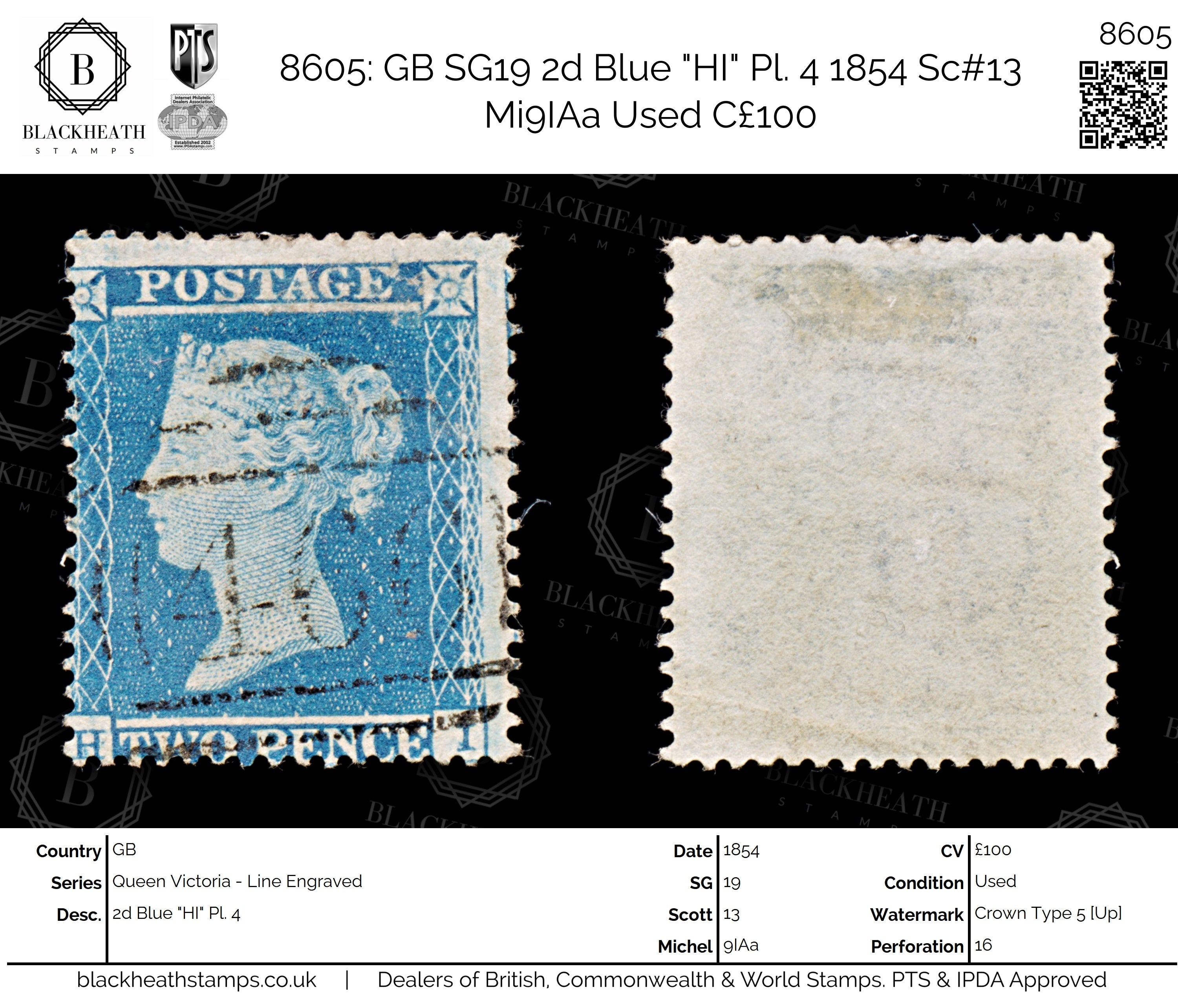 8605: GB SG19 2d Blue "HI" Pl. 4 1854 Sc#13 Mi9IAa Uséd C£100