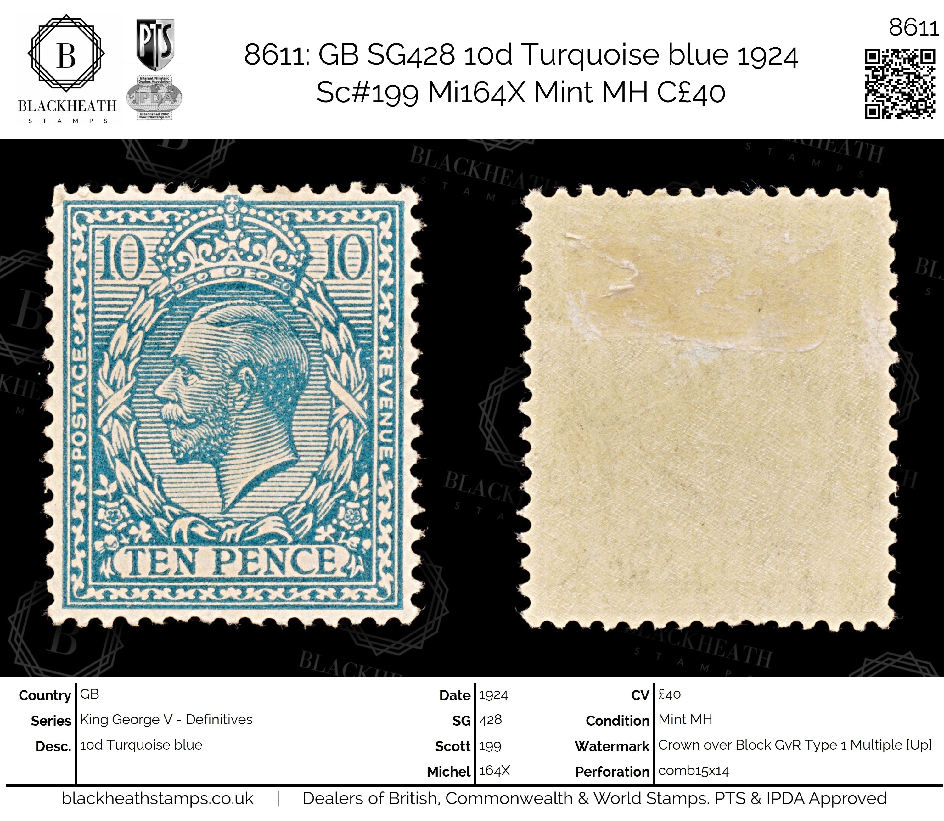 8611: GB SG428 10d Turquoise blue 1924 Sc#199 Mi164X Mint MH C£40