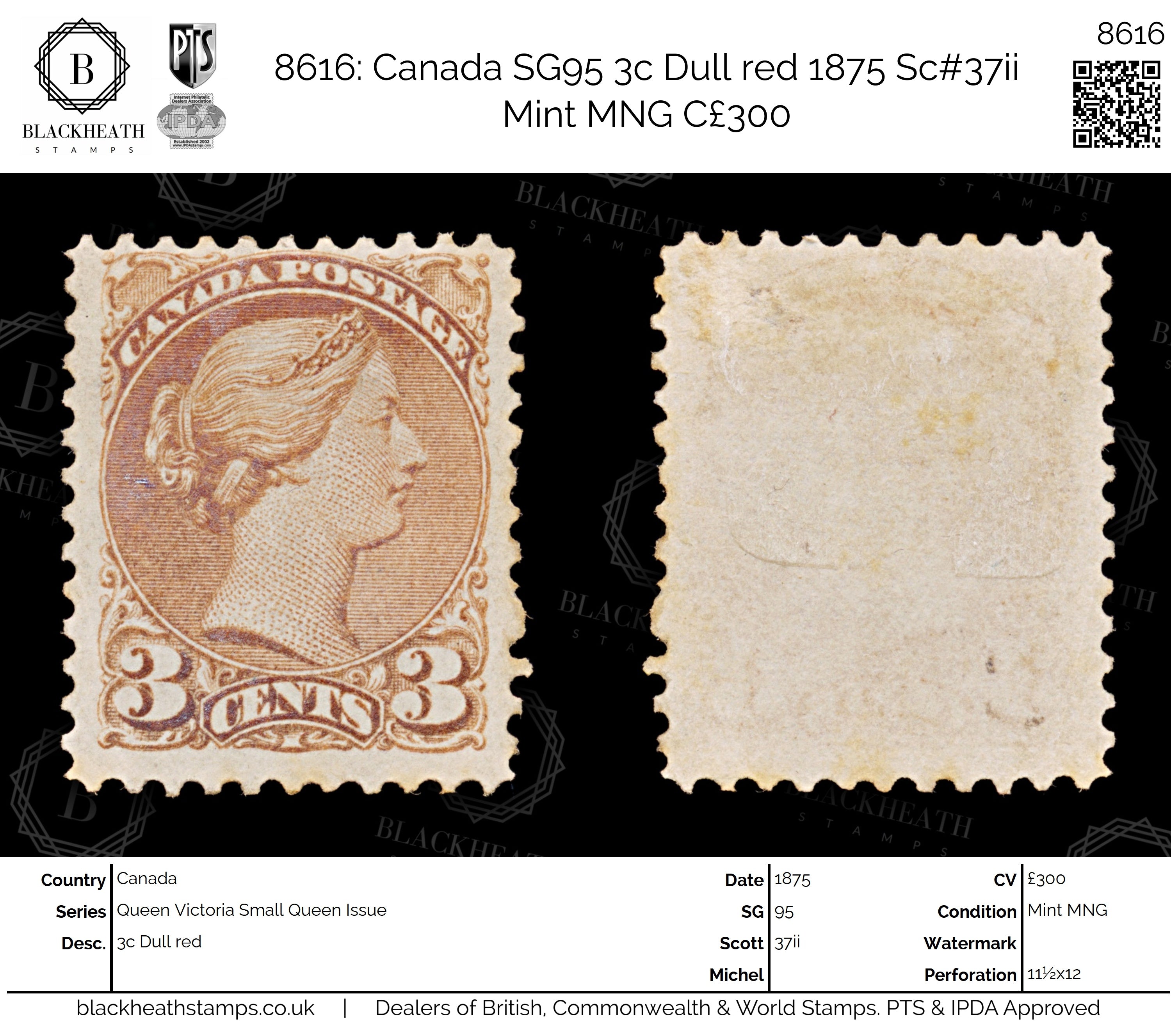8616: Canada SG95 3c Dull red 1875 Sc#37ii Mint MNG C£300