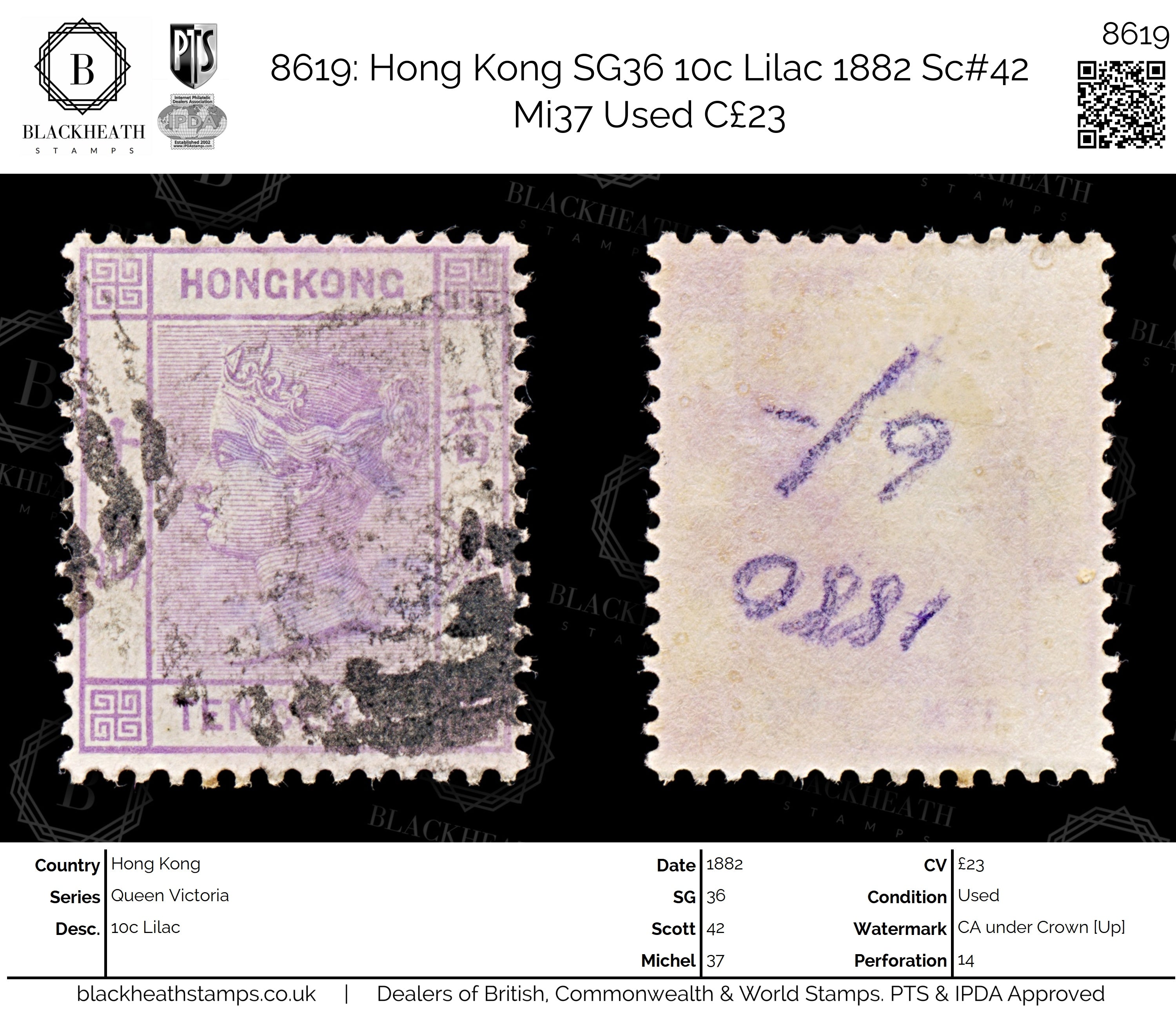 8619: Hong Kong SG36 10c Lilac 1882 Sc#42 Mi37 Used C£23