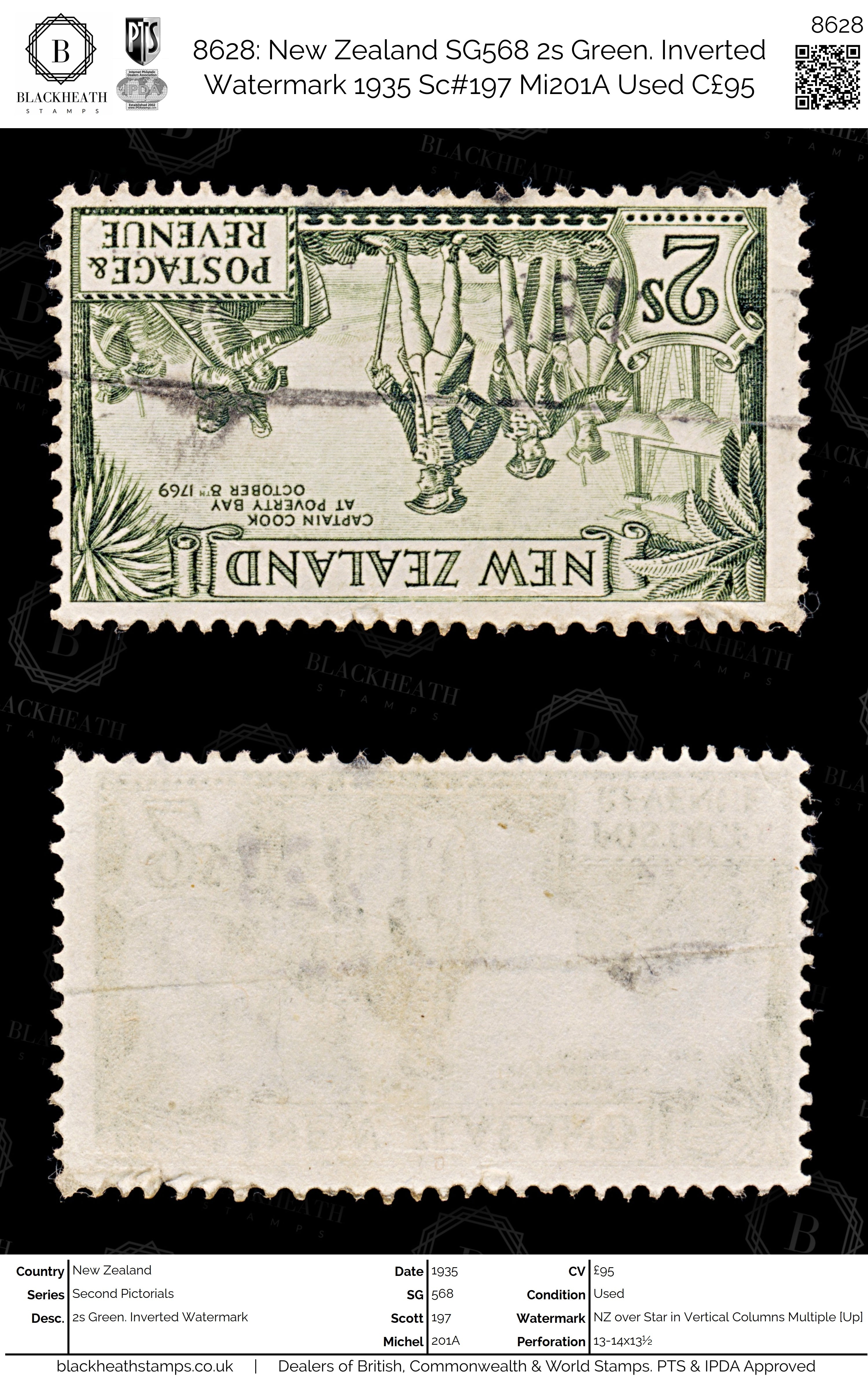 8628: New Zealand SG568 2s Green. Inverted Watermark 1935 Sc#197 Mi201A Uséd C£95