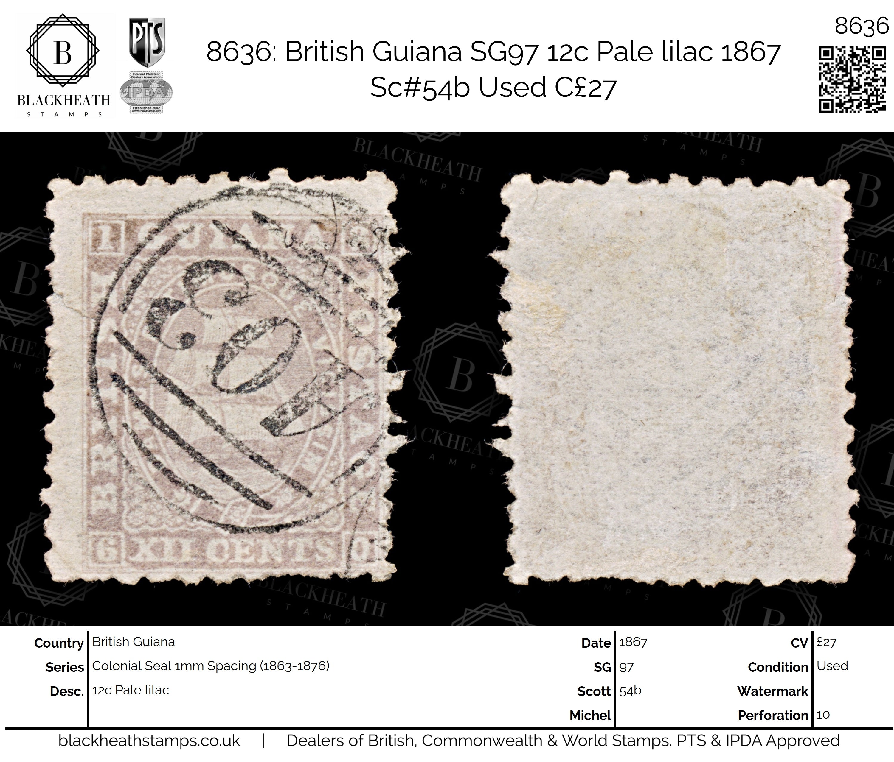 8636: British Guiana SG97 12c Pale lilac 1867 Sc#54b Used C£27
