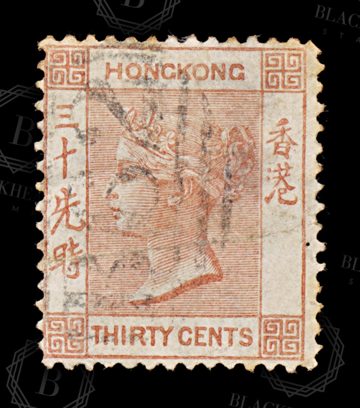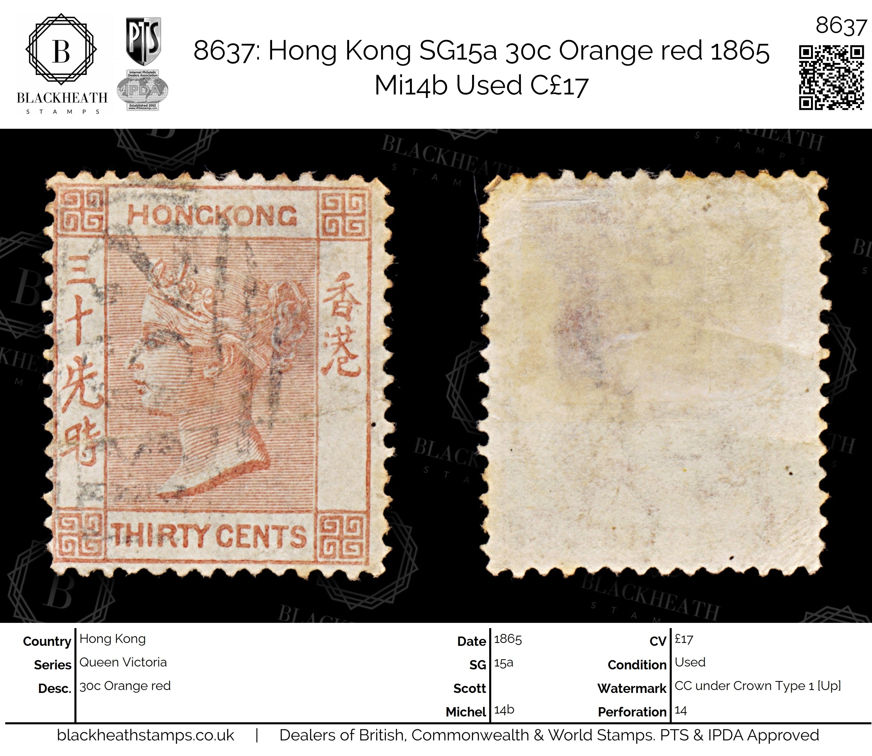 8637: Hong Kong SG15a 30c Orange red 1865 Mi14b Uséd C£17