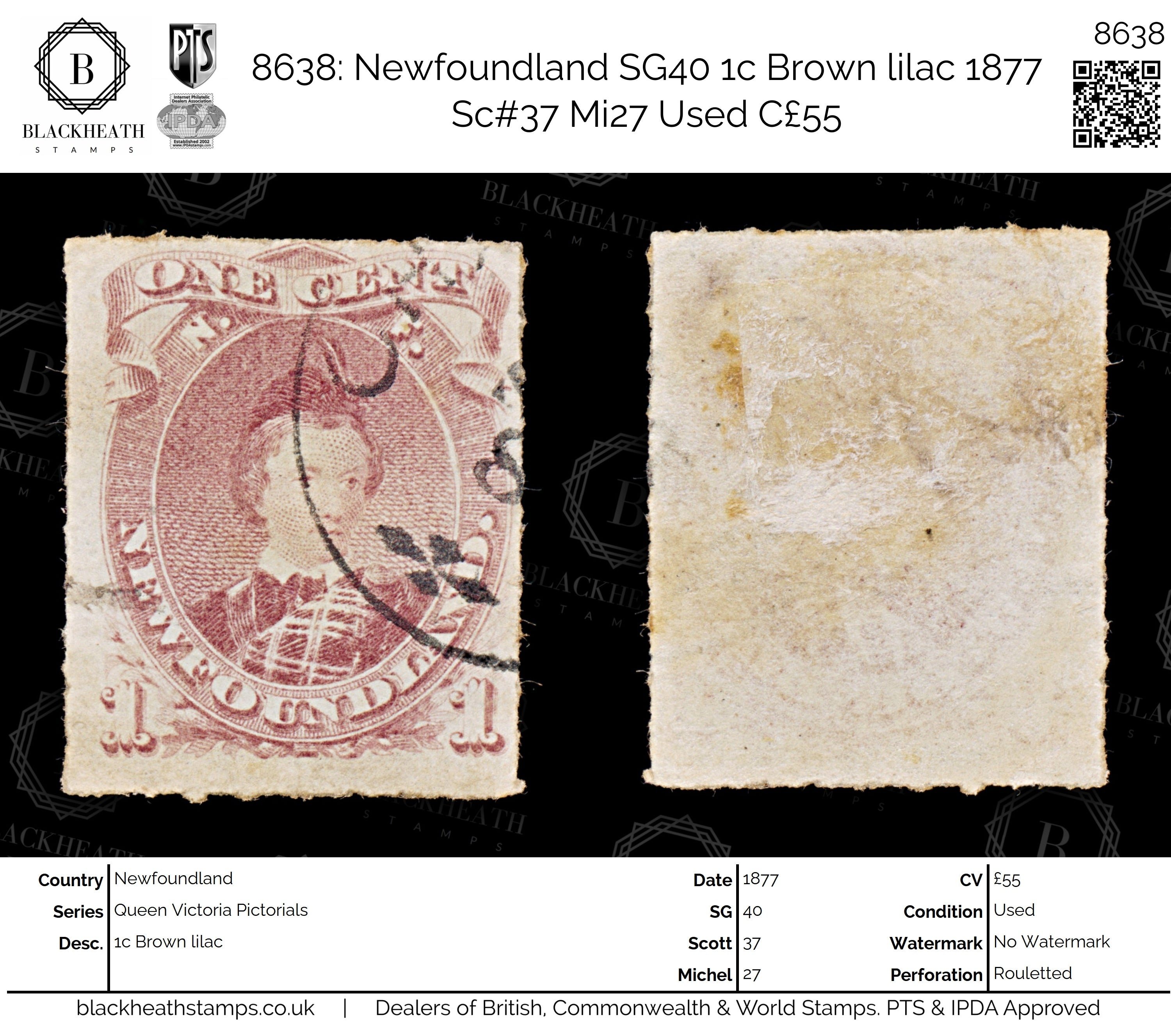 8638: Newfoundland SG40 1c Brown lilac 1877 Sc#37 Mi27 Used C£55