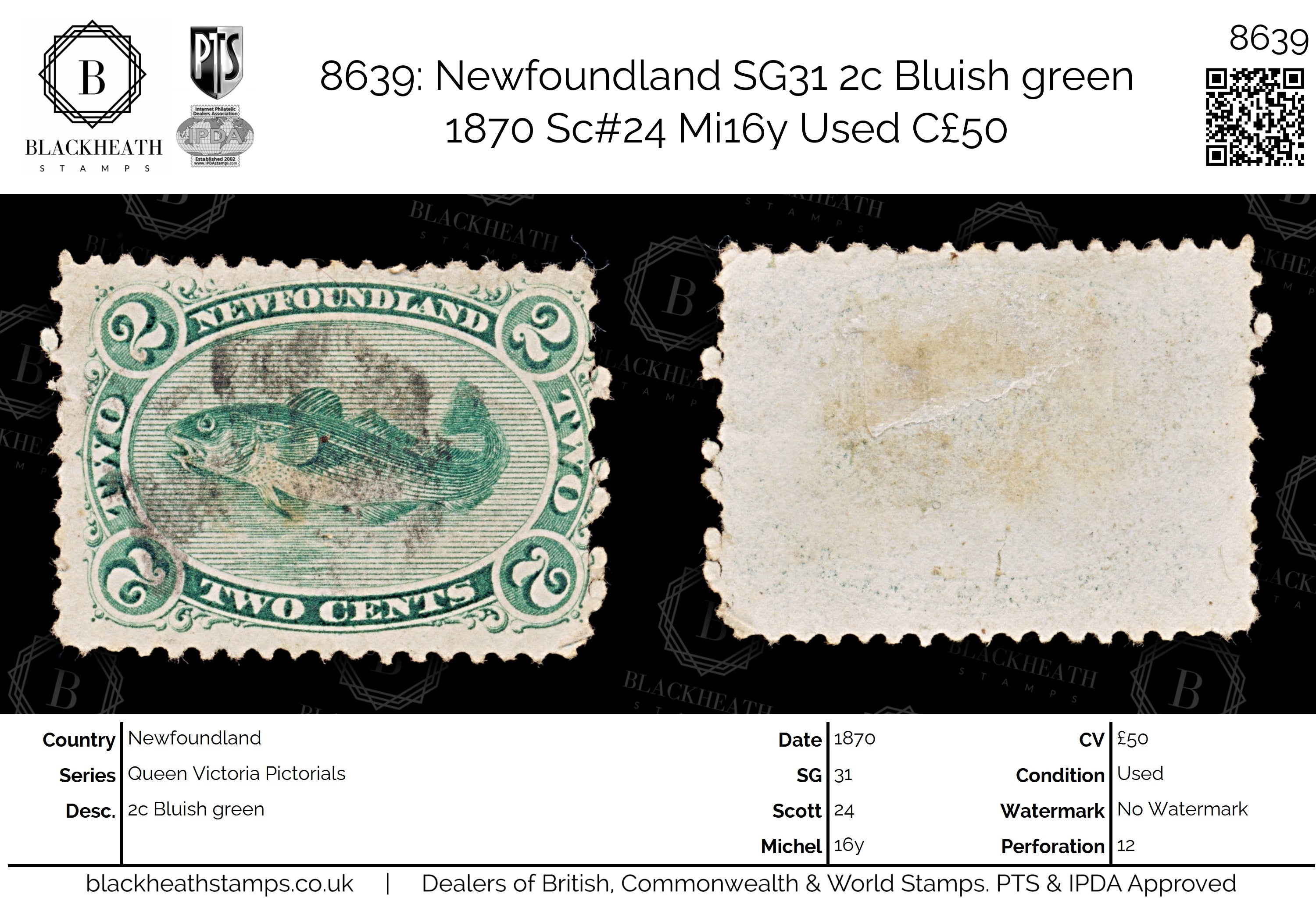 8639: Newfoundland SG31 2c Bluish green 1870 Sc#24 Mi16y Used C£50
