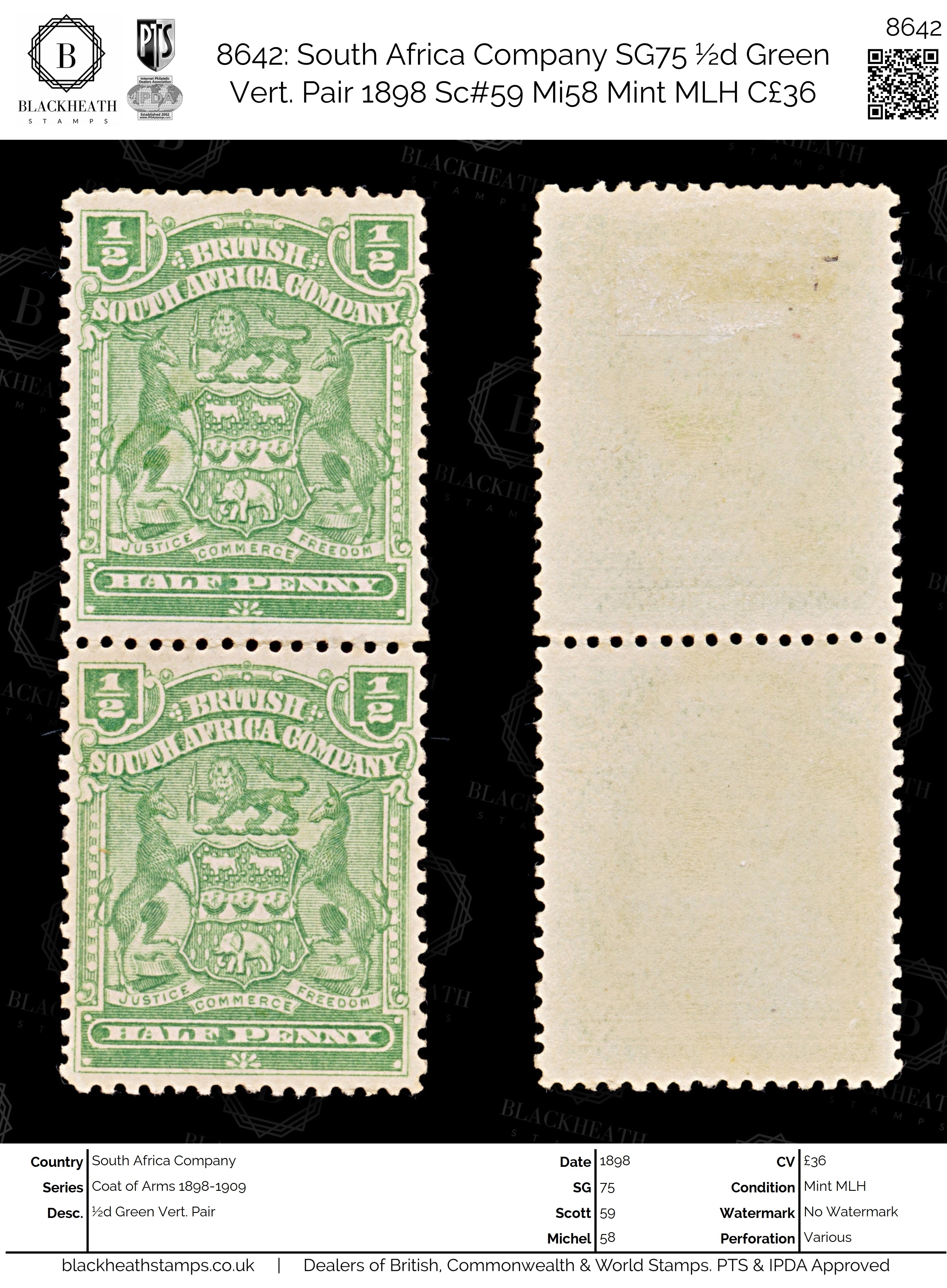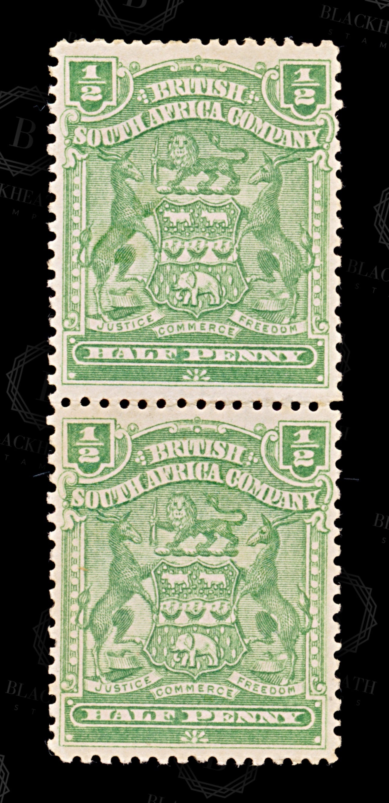 8642: South Africa Company SG75 ½d Green Vert. Pair 1898 Sc#59 Mi58 Mint MLH C£36