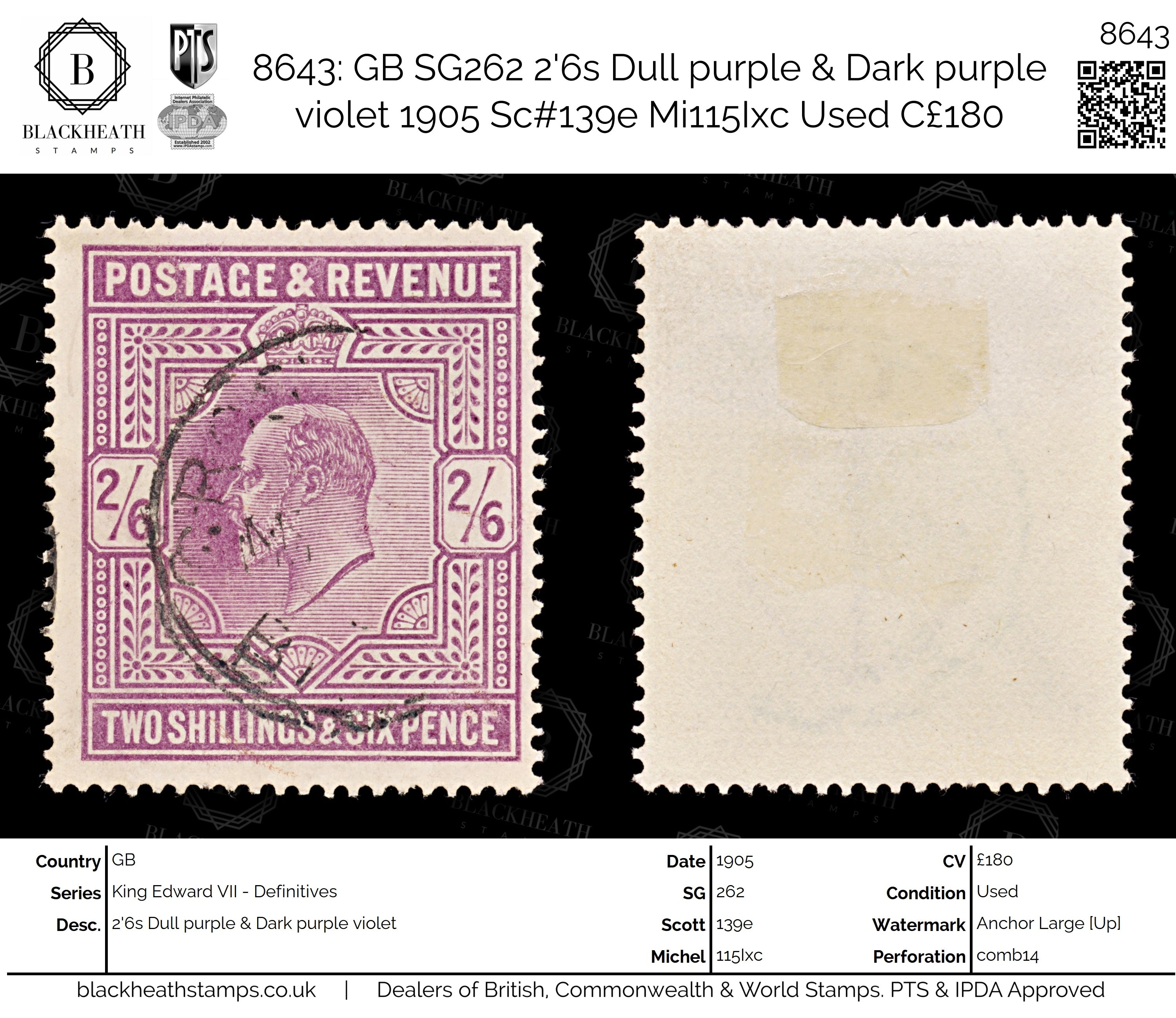 8643: GB SG262 2'6s Dull purple & Dark purple violet 1905 Sc#139e Mi115Ixc Uséd C£180