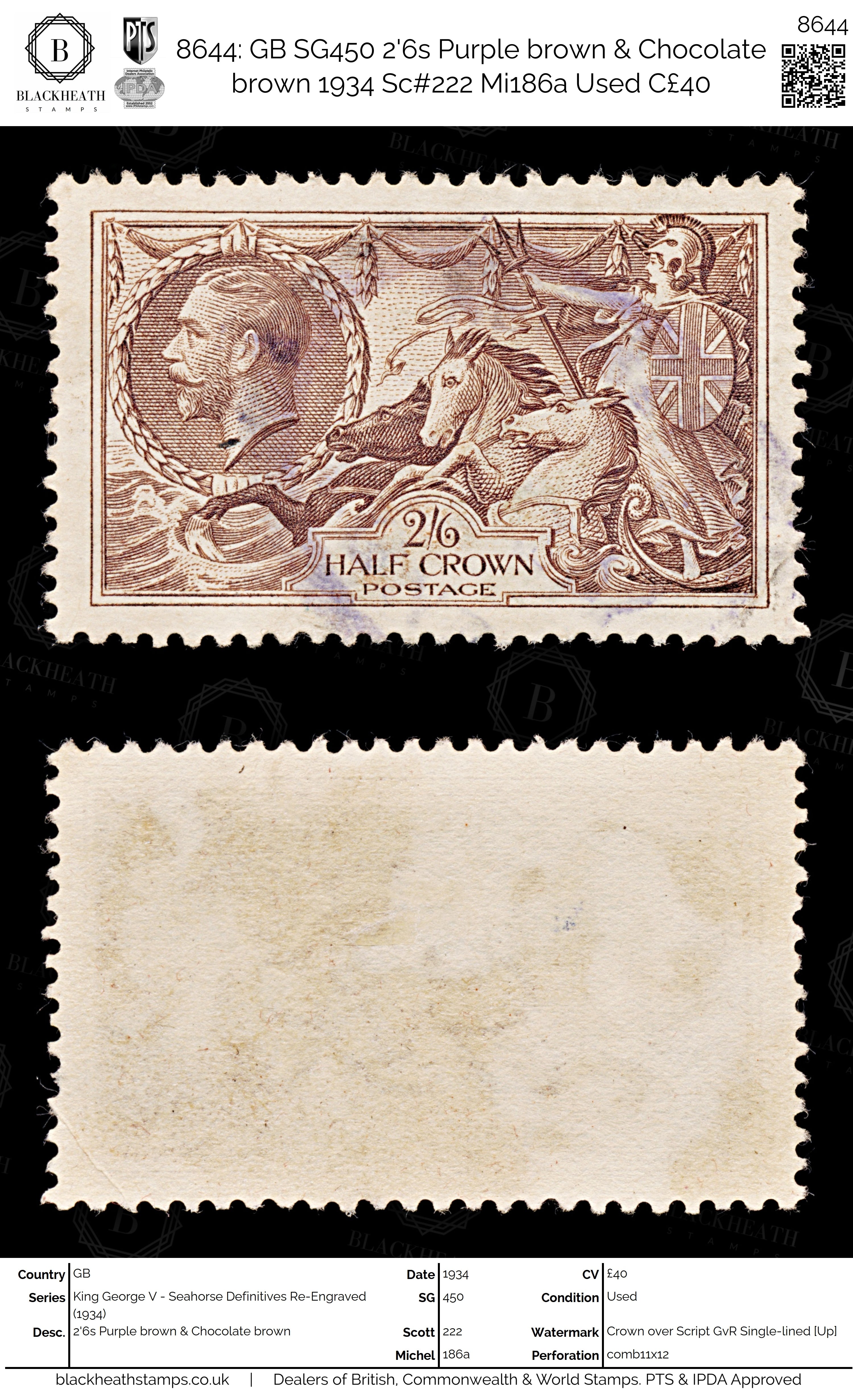 8644: GB SG450 2'6s Purple brown & Chocolate brown 1934 Sc#222 Mi186a Uséd C£40
