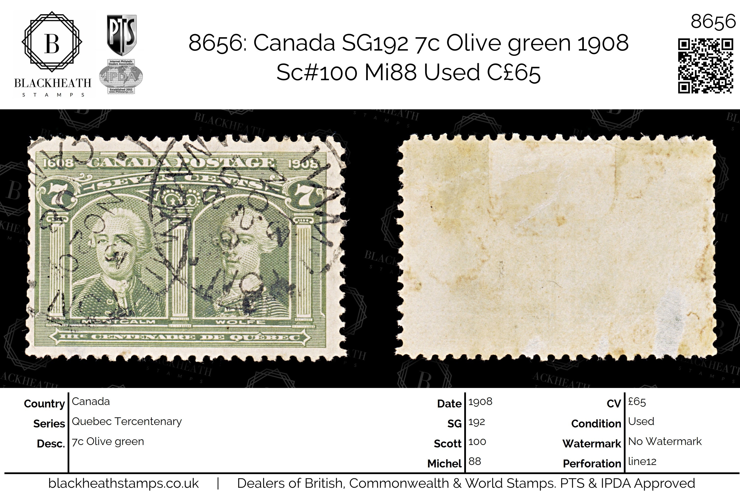 8656: Canada SG192 7c Olive green 1908 Sc#100 Mi88 Uséd C£65