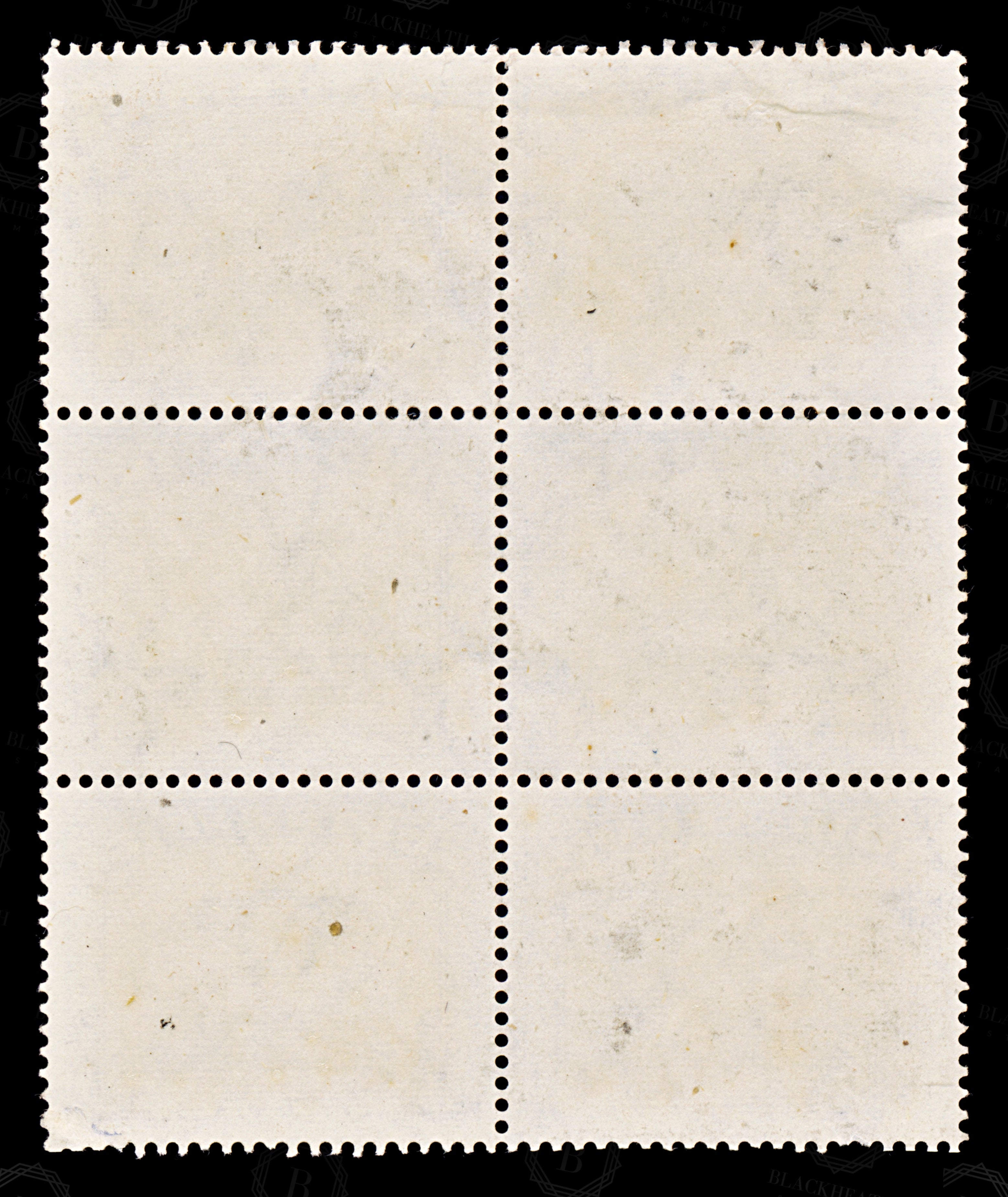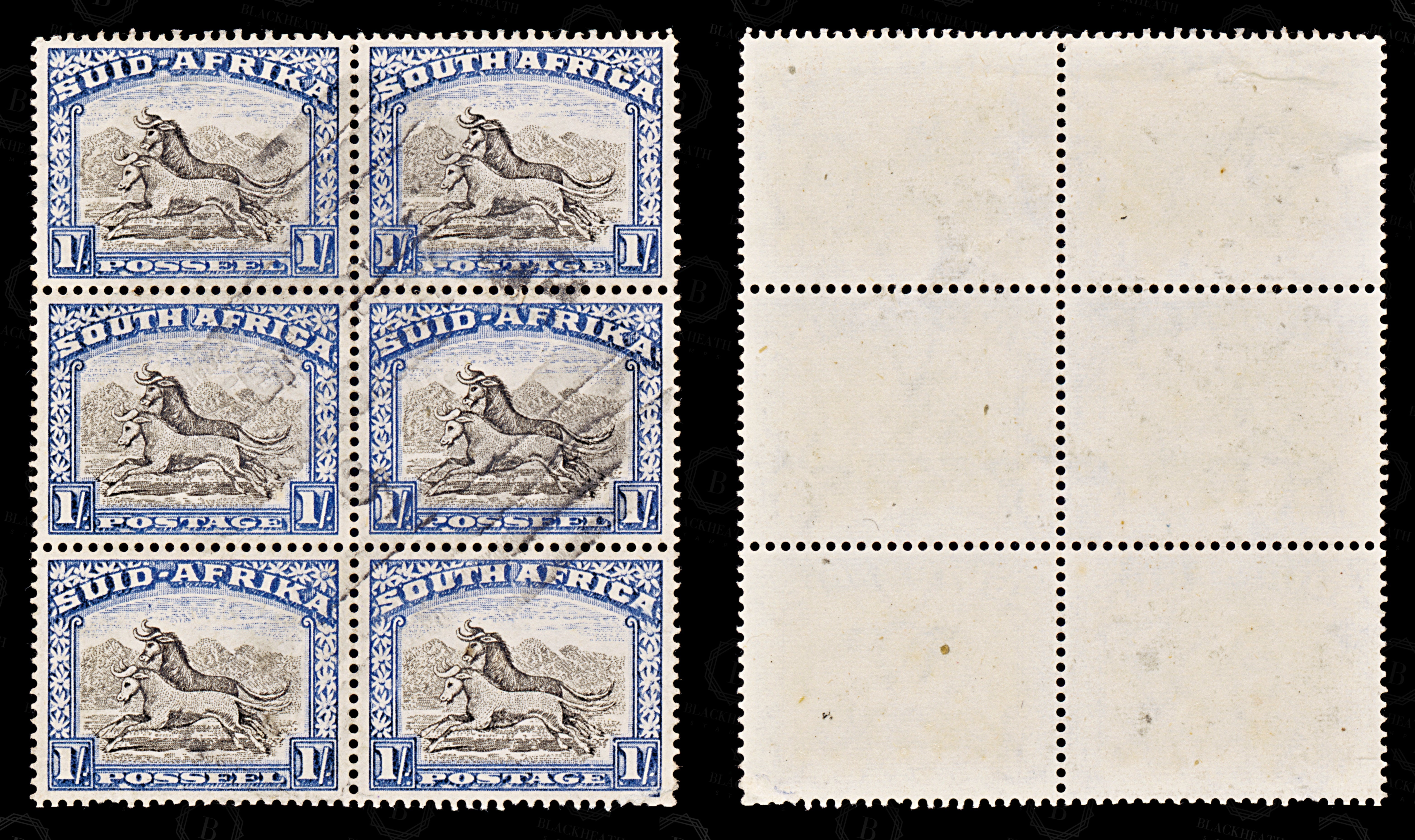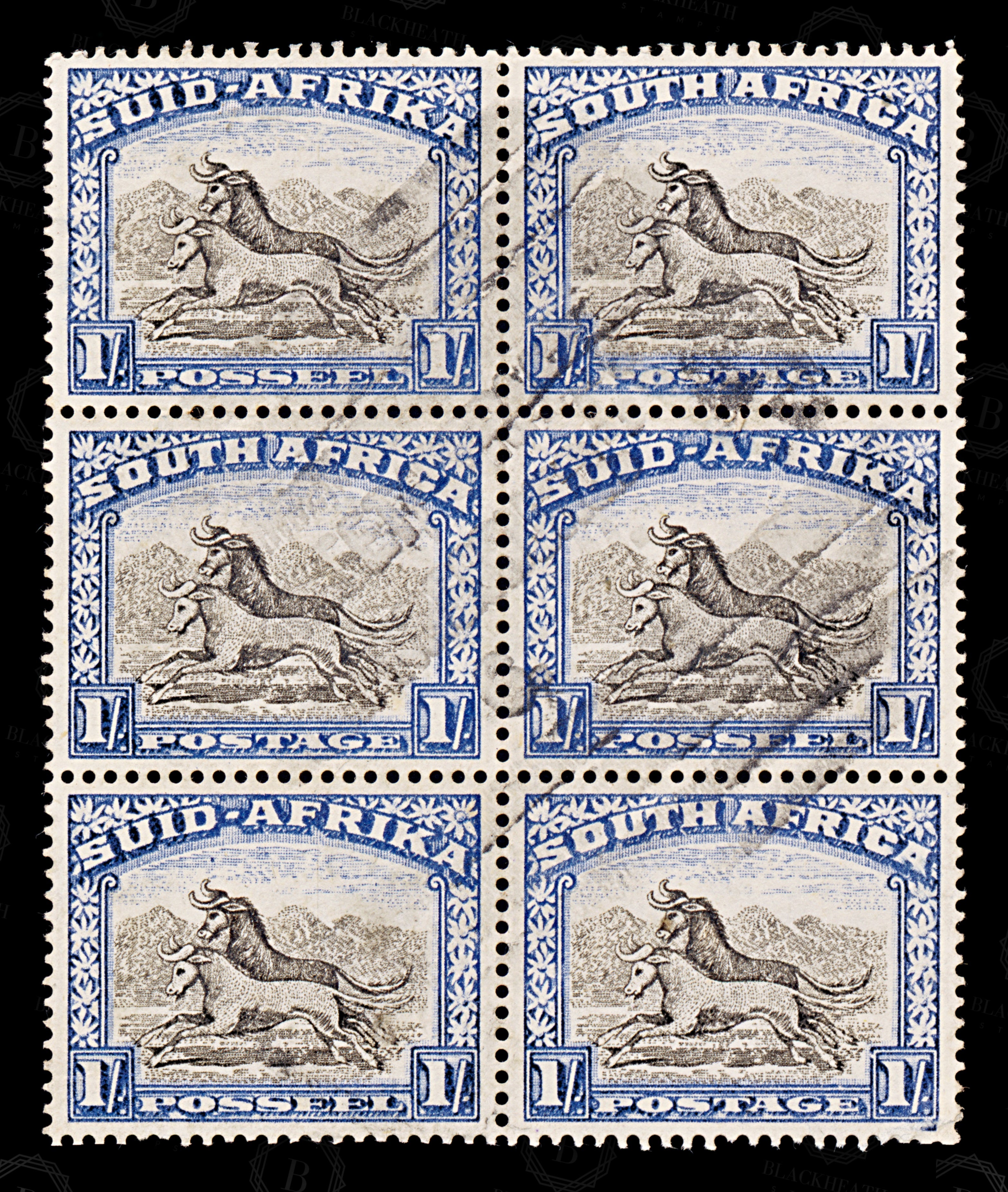 8663: South Africa SG120 1s Blue & Black. Block of 6 1950 Mi199-200 Used C£48