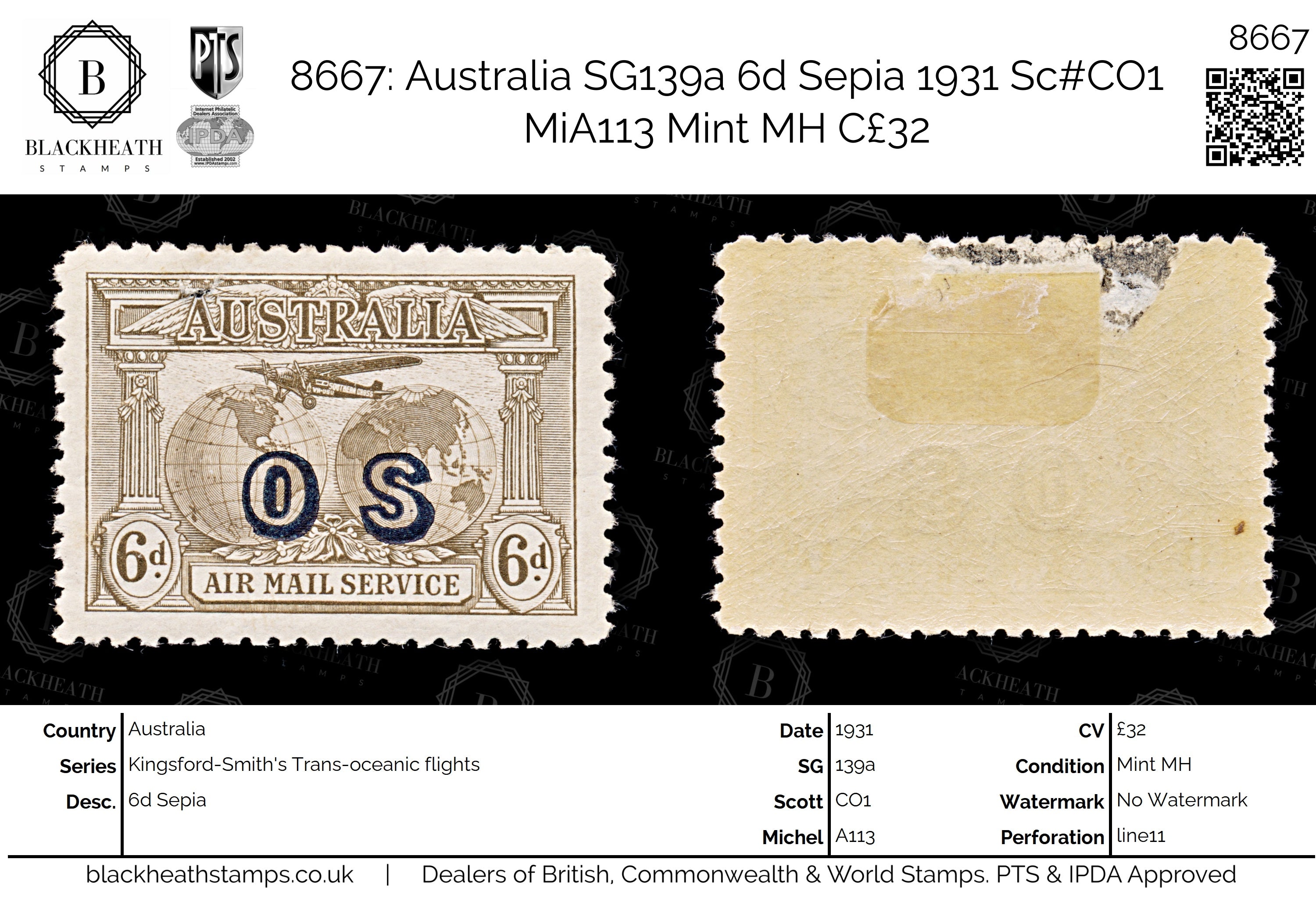 8667: Australia SG139a 6d Sepia 1931 Sc#CO1 MiA113 Mint MH C£32