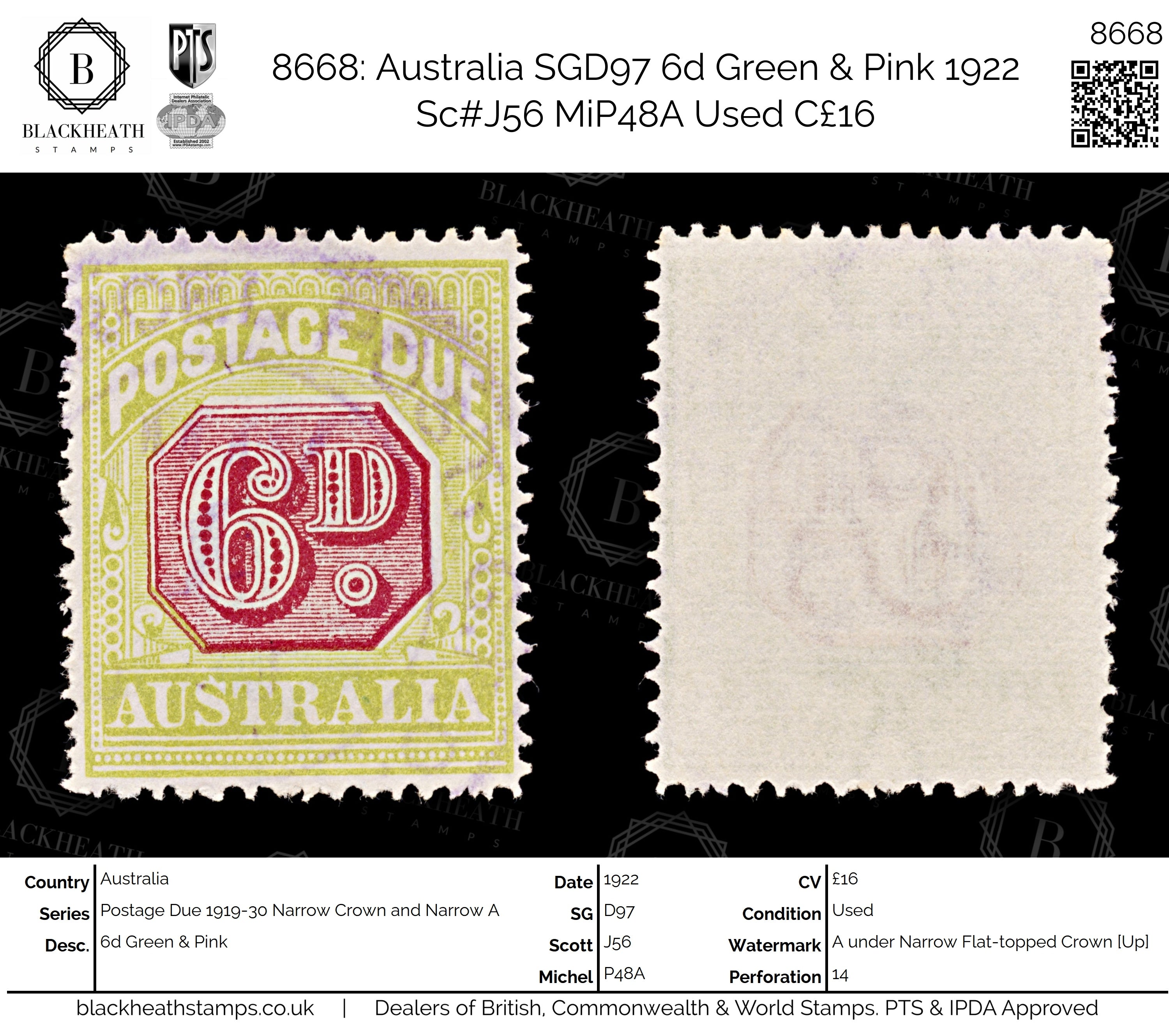 8668: Australia SGD97 6d Green & Pink 1922 Sc#J56 MiP48A Uséd C£16