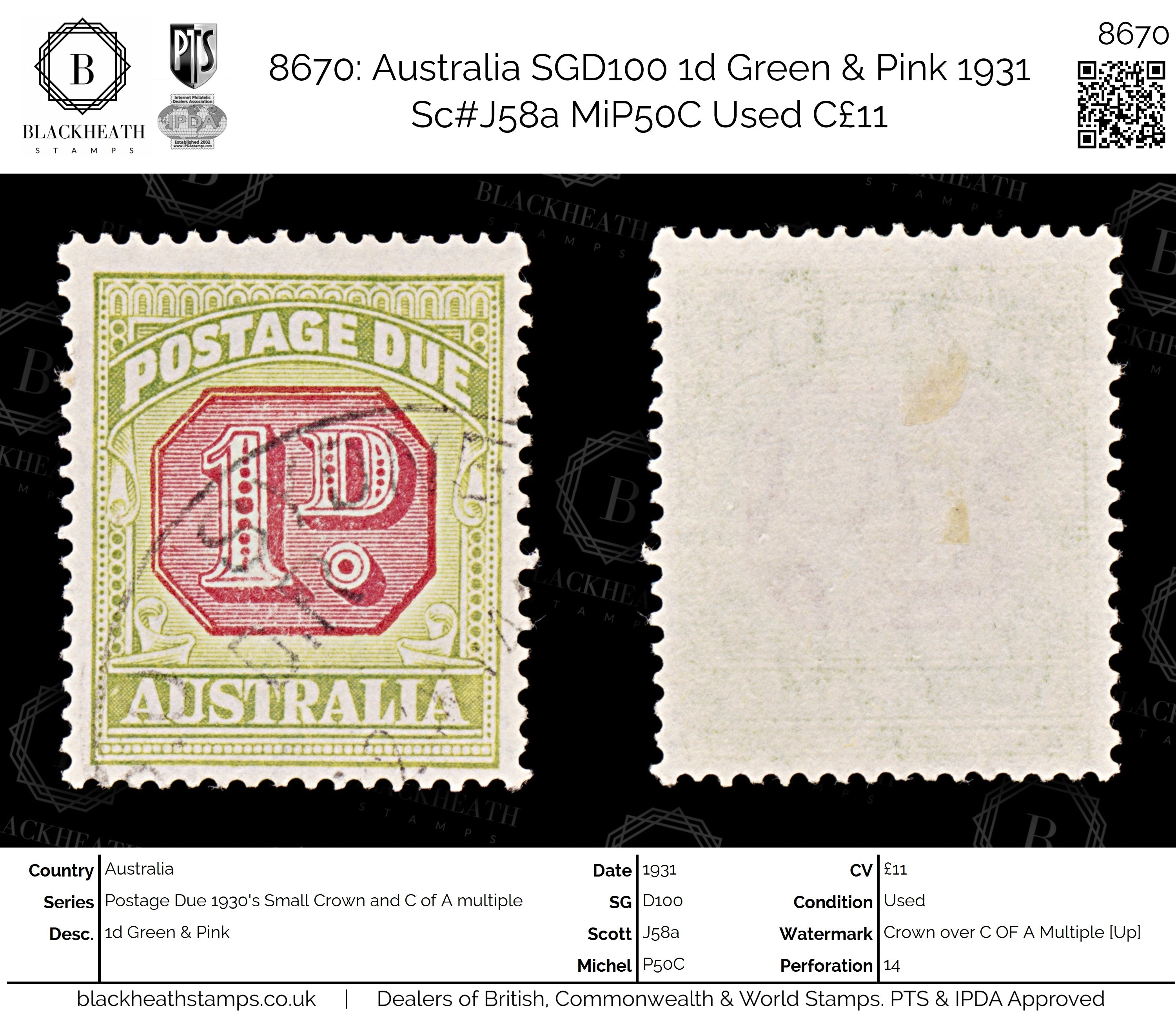8670: Australia SGD100 1d Green & Pink 1931 Sc#J58a MiP50C Used C£11