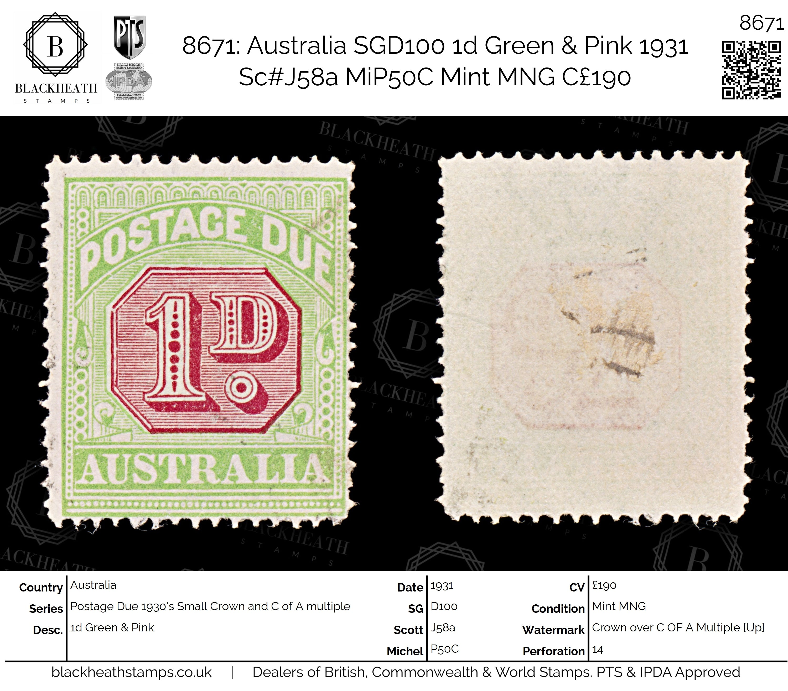 8671: Australia SGD100 1d Green & Pink 1931 Sc#J58a MiP50C Mint MNG C£190