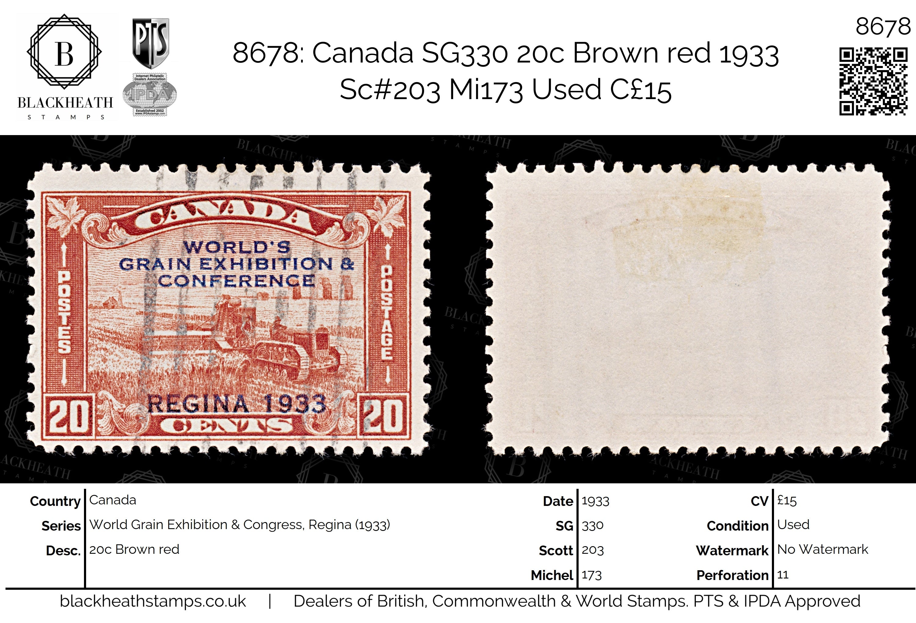 8678: Canada SG330 20c Brown red 1933 Sc#203 Mi173 Uséd C£15