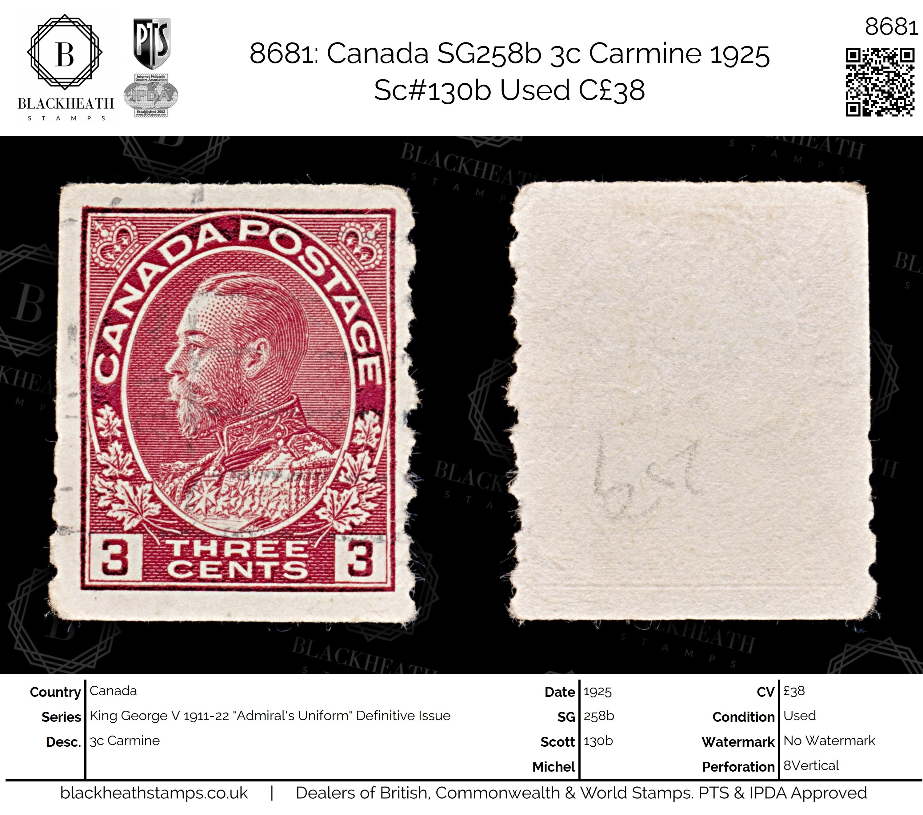 8681: Canada SG258b 3c Carmine 1925 Sc#130b Uséd C£38
