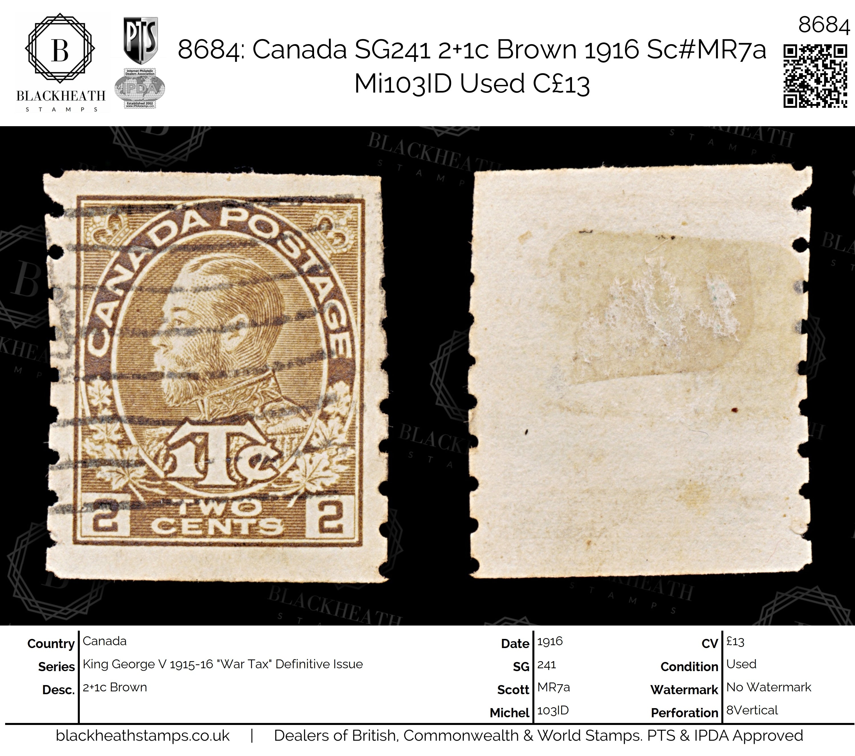 8684: Canada SG241 2+1c Brown 1916 Sc#MR7a Mi103ID Used C£13