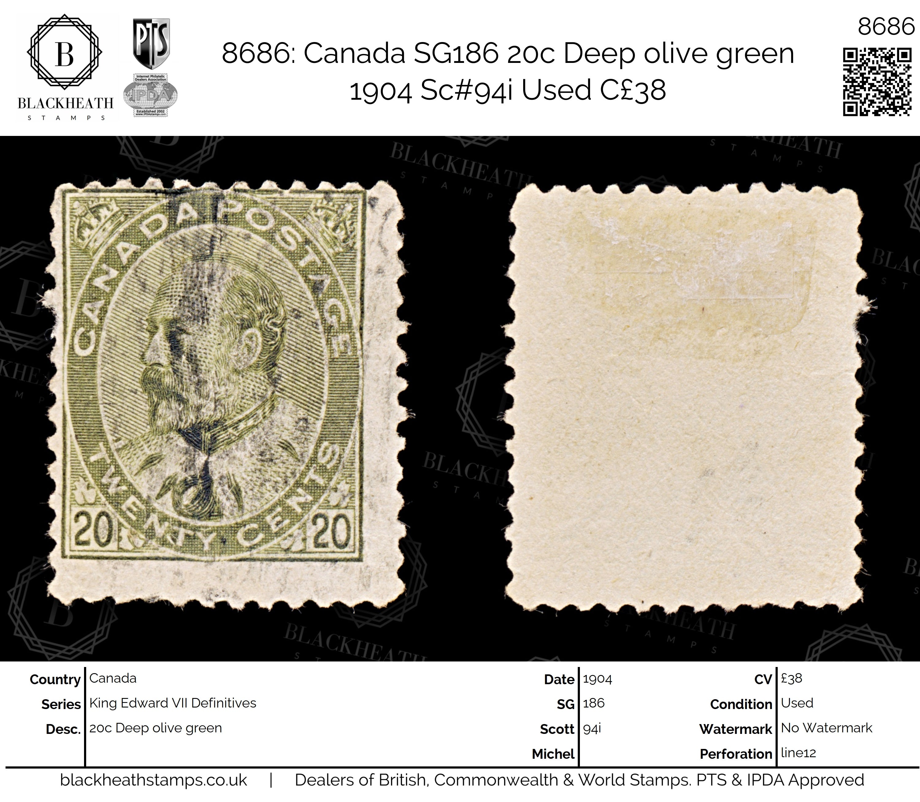 8686: Canada SG186 20c Deep olive green 1904 Sc#94i Uséd C£38