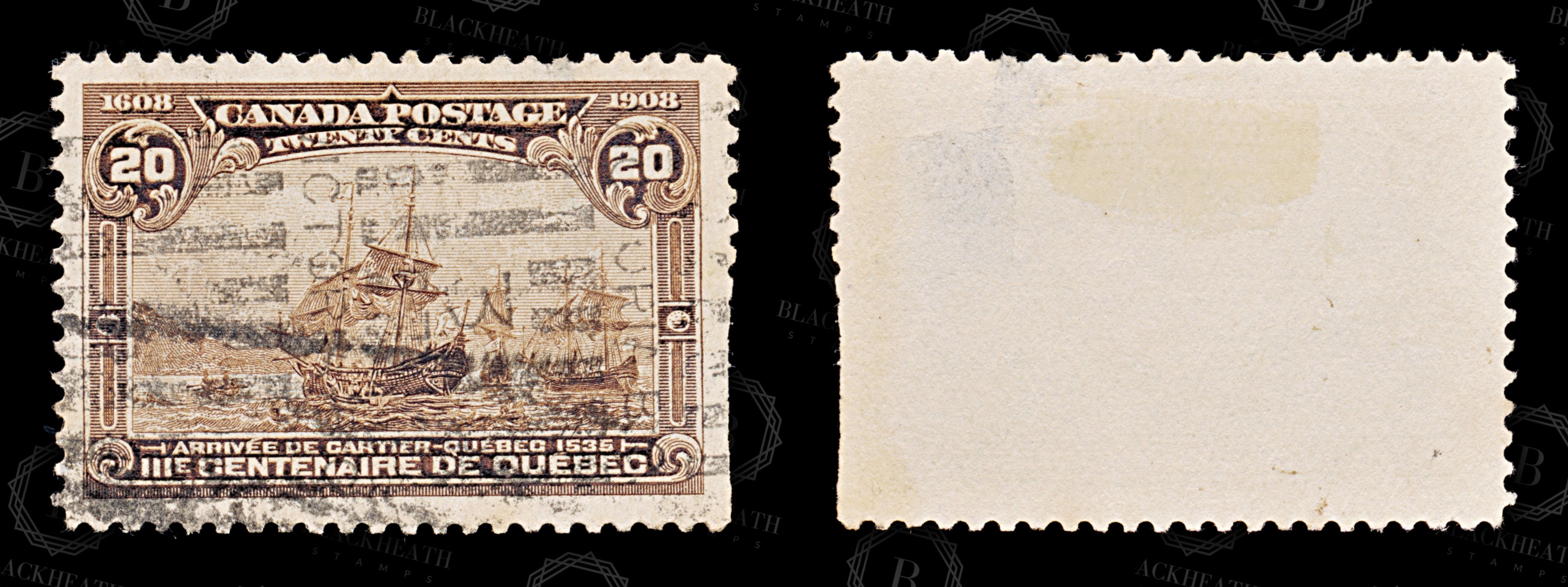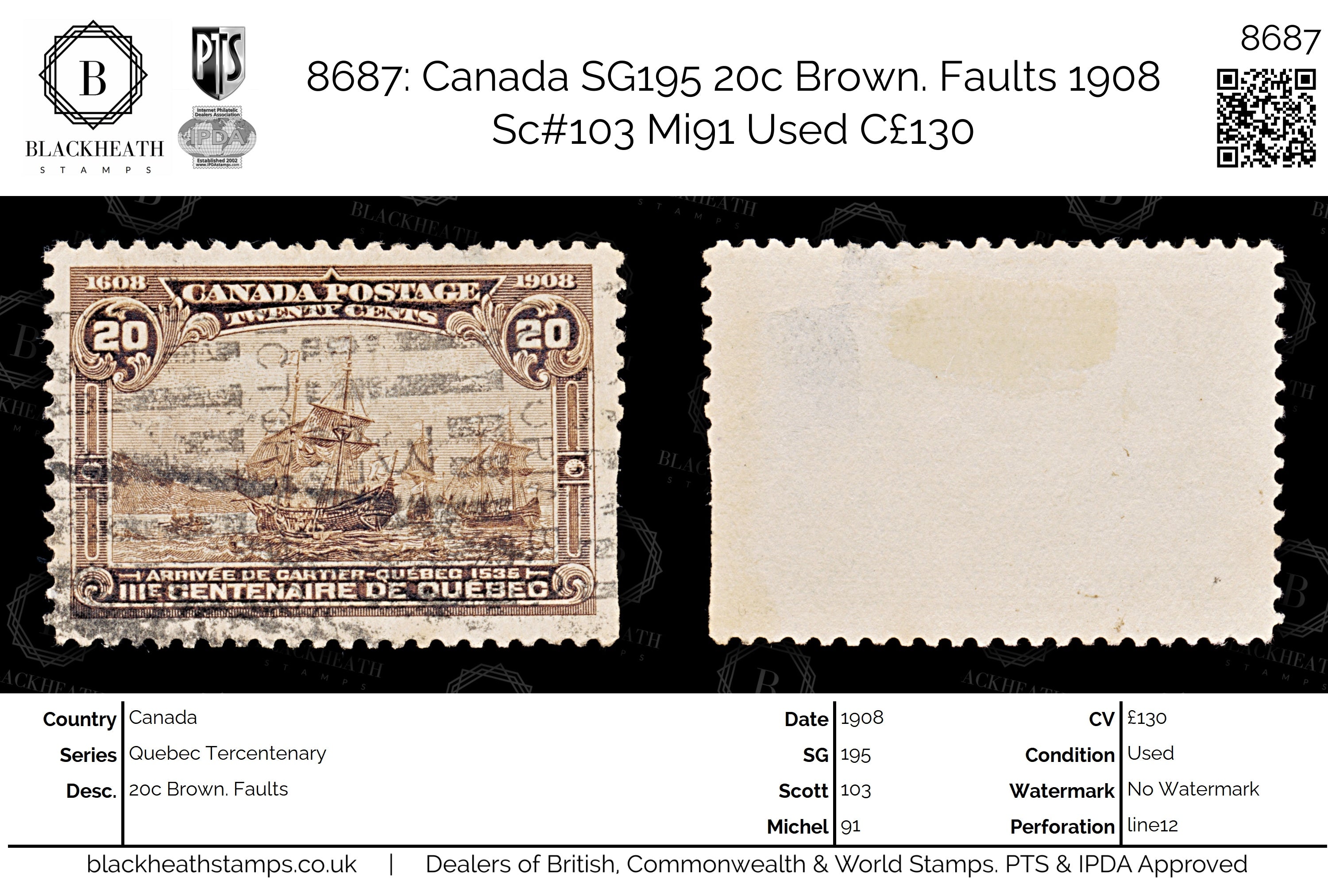 8687: Canada SG195 20c Brown. Faults 1908 Sc#103 Mi91 Uséd C£130