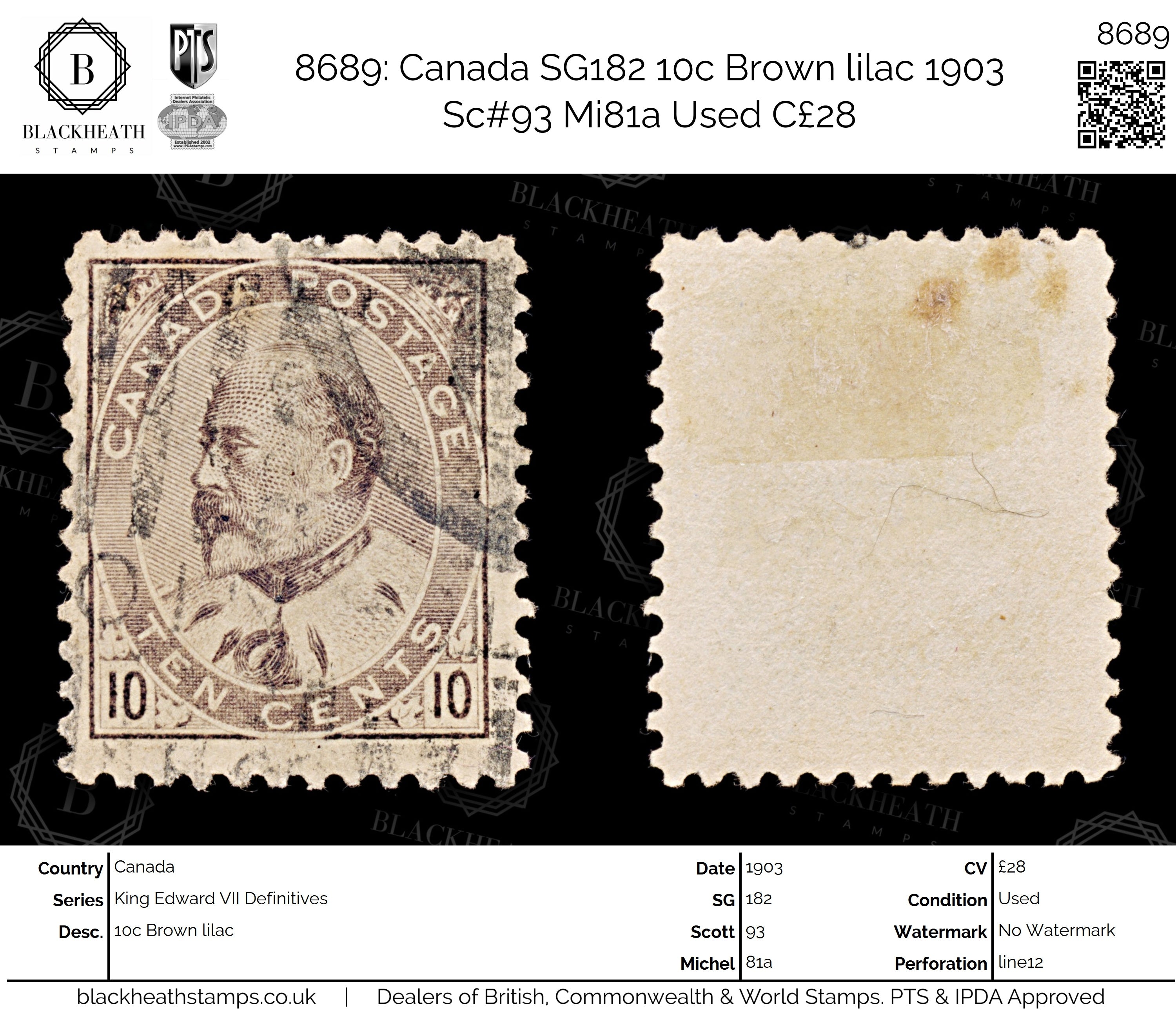 8689: Canada SG182 10c Brown lilac 1903 Sc#93 Mi81a Uséd C£28