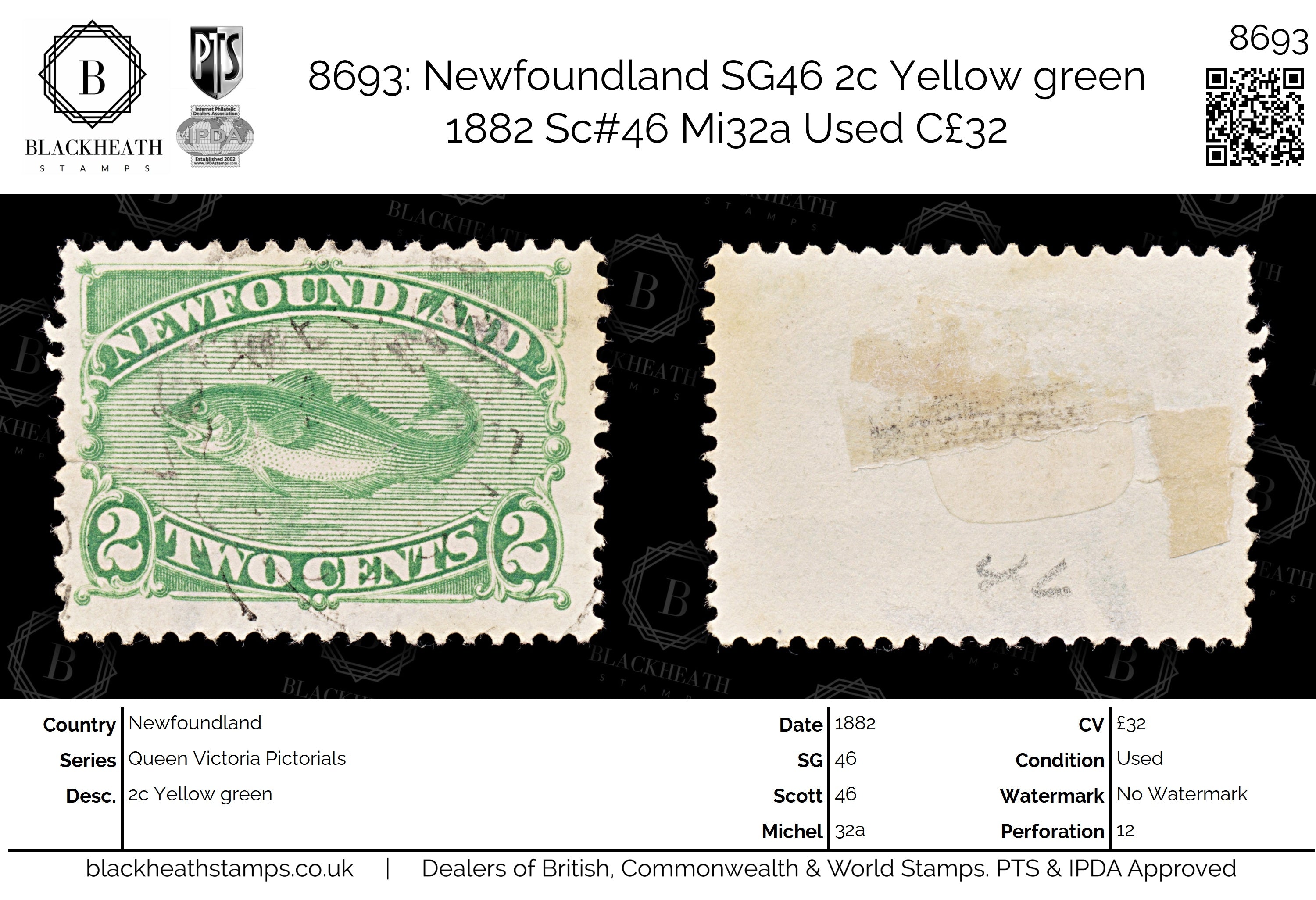 8693: Newfoundland SG46 2c Yellow green 1882 Sc#46 Mi32a Used C£32
