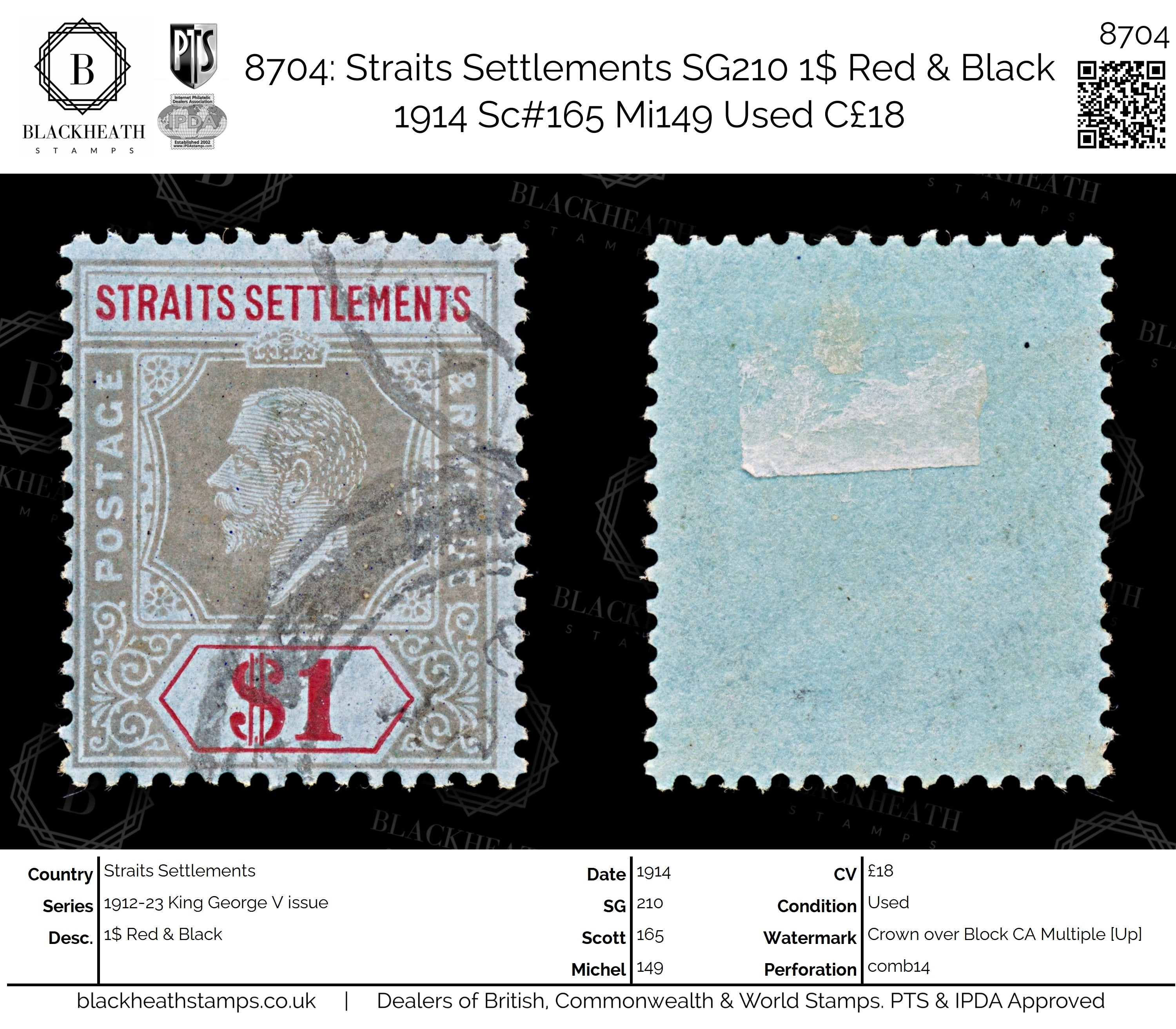 8704: Straits Settlements SG210 1$ Red & Black 1914 Sc#165 Mi149 Uséd C£18
