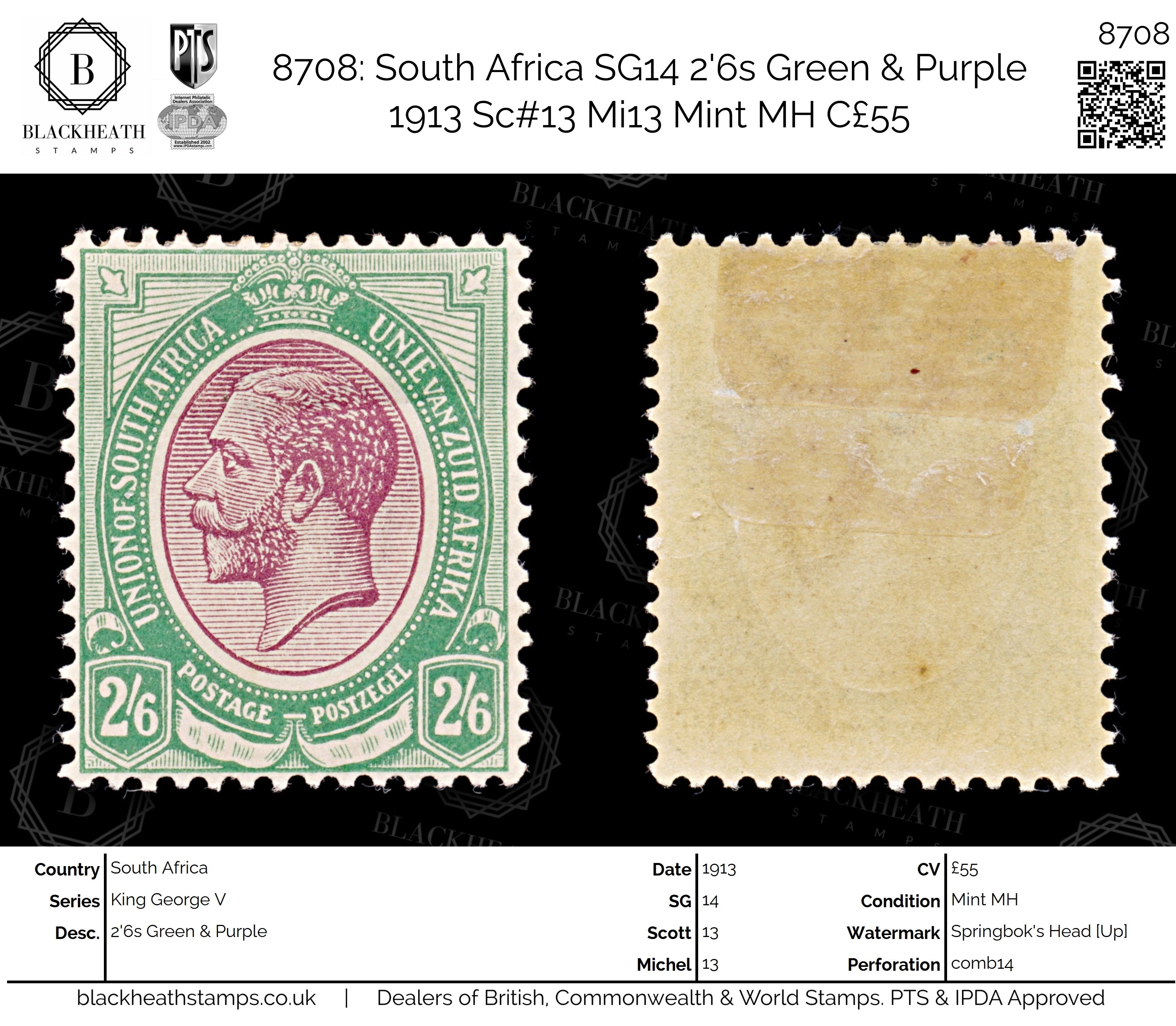 8708: South Africa SG14 2'6s Green & Purple 1913 Sc#13 Mi13 Mint MH C£55