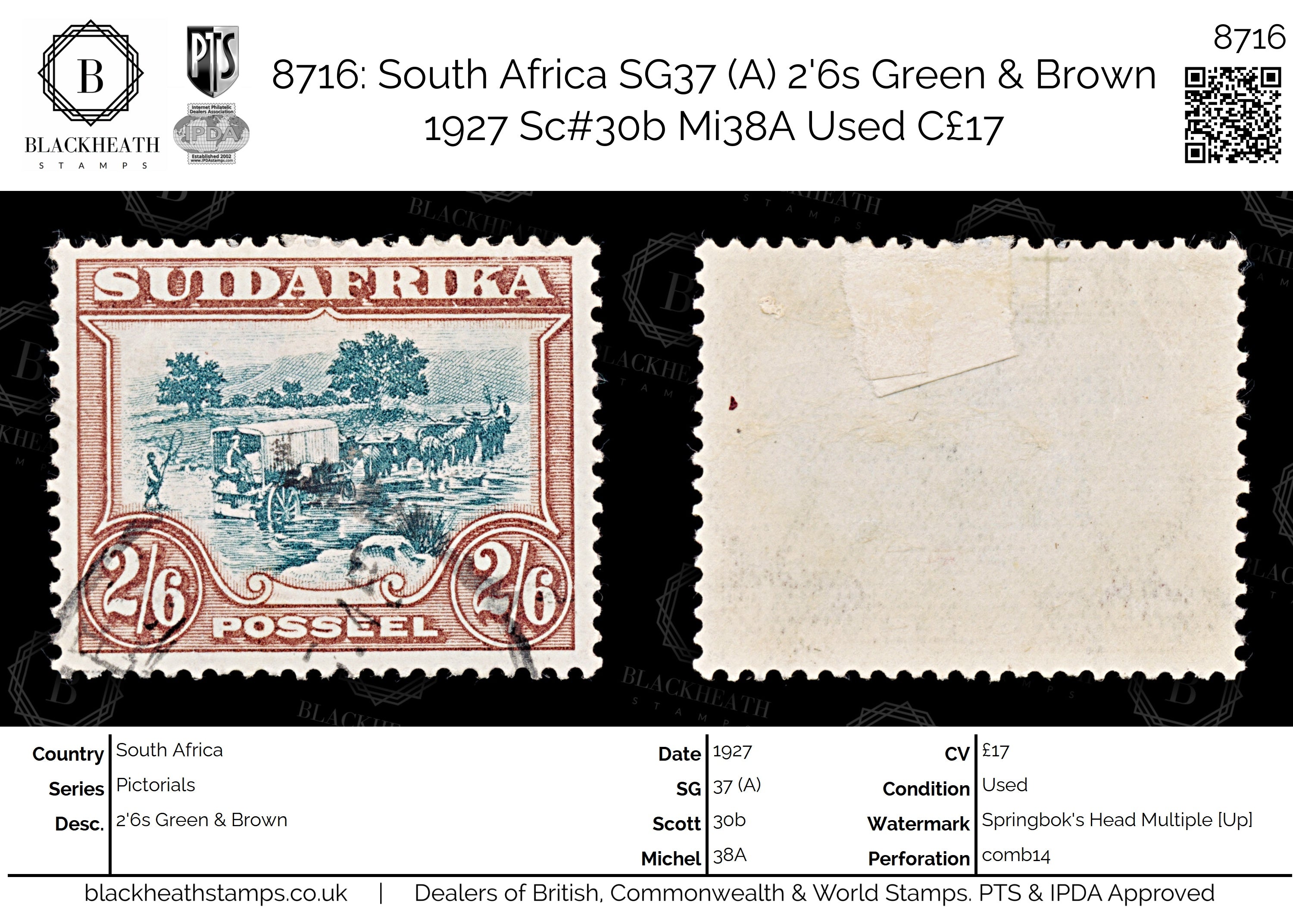 8716: South Africa SG37 (A) 2'6s Green & Brown 1927 Sc#30b Mi38A Uséd C£17