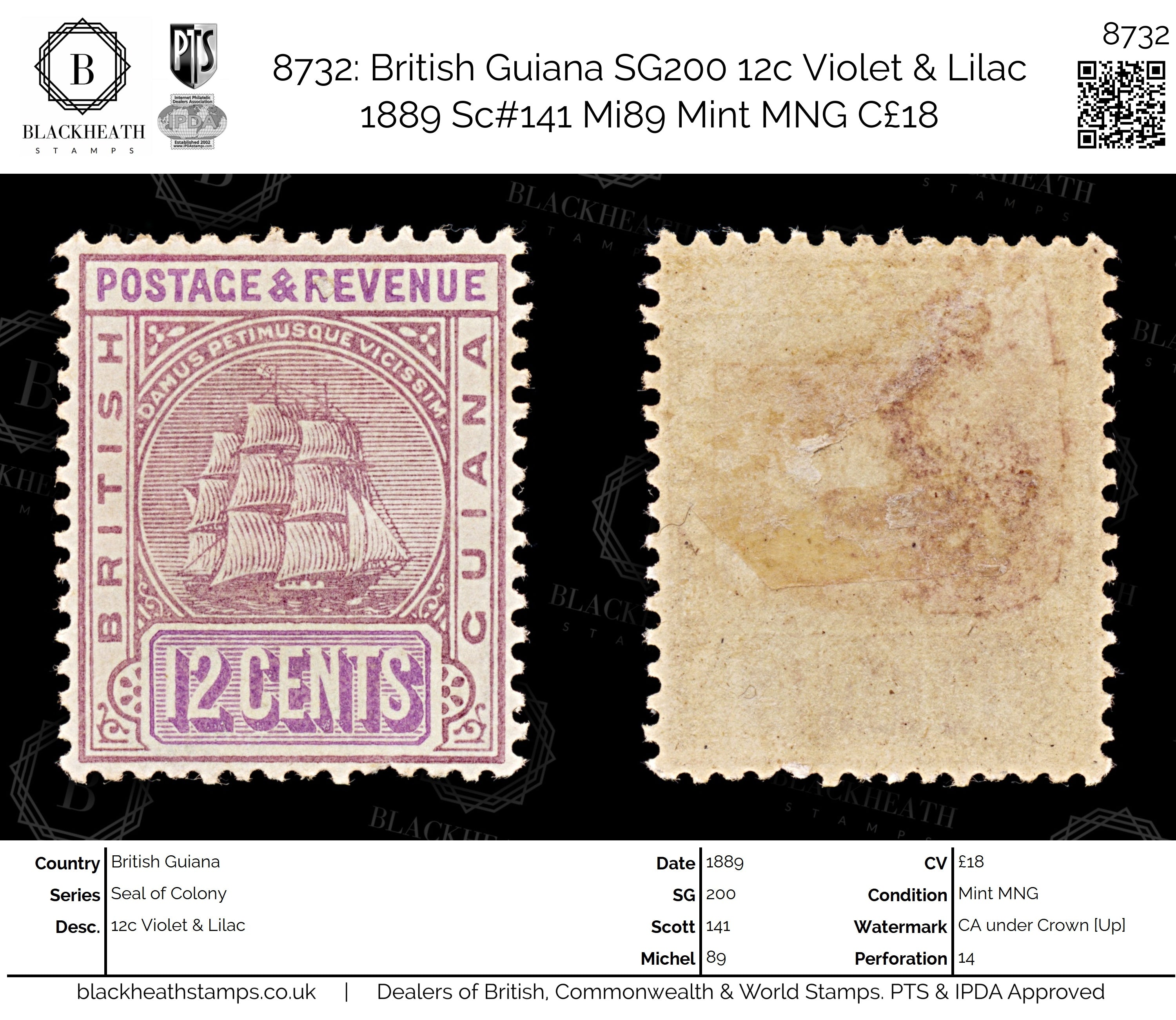 8732: British Guiana SG200 12c Violet & Lilac 1889 Sc#141 Mi89 Mint MNG C£18