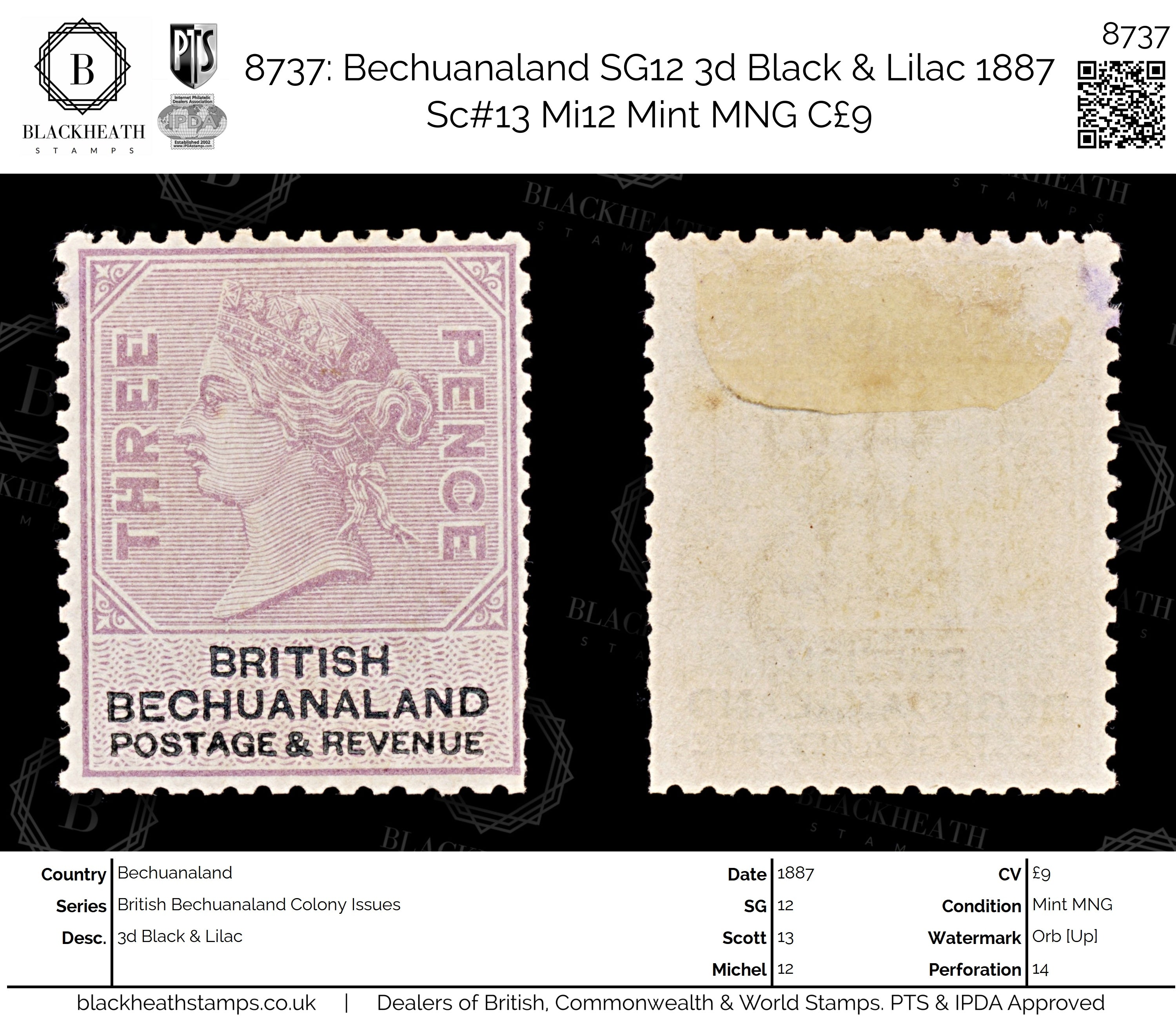 8737: Bechuanaland SG12 3d Black & Lilac 1887 Sc#13 Mi12 Mint MNG C£9