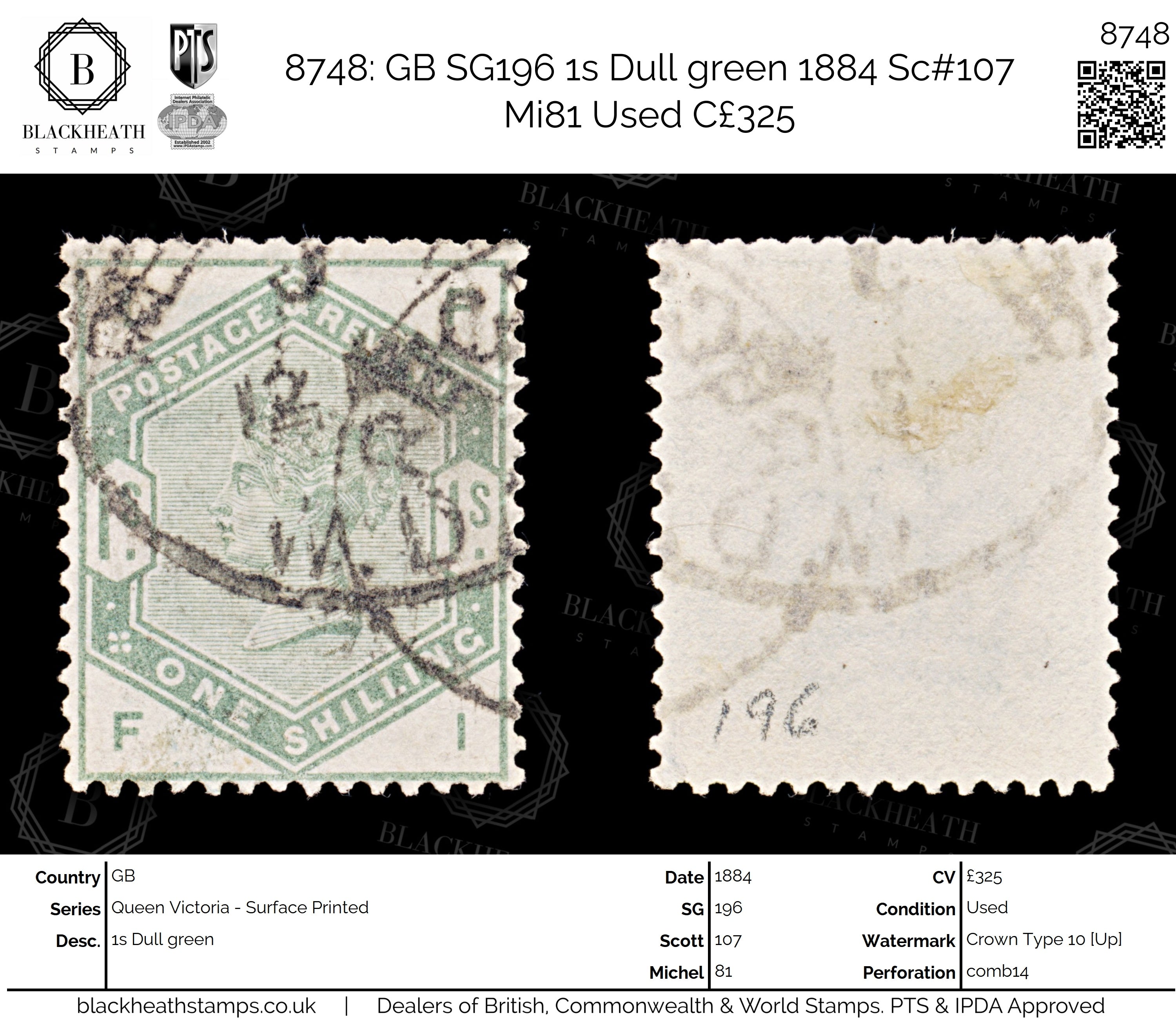 8748: GB SG196 1s Dull green 1884 Sc#107 Mi81 Uséd C£325
