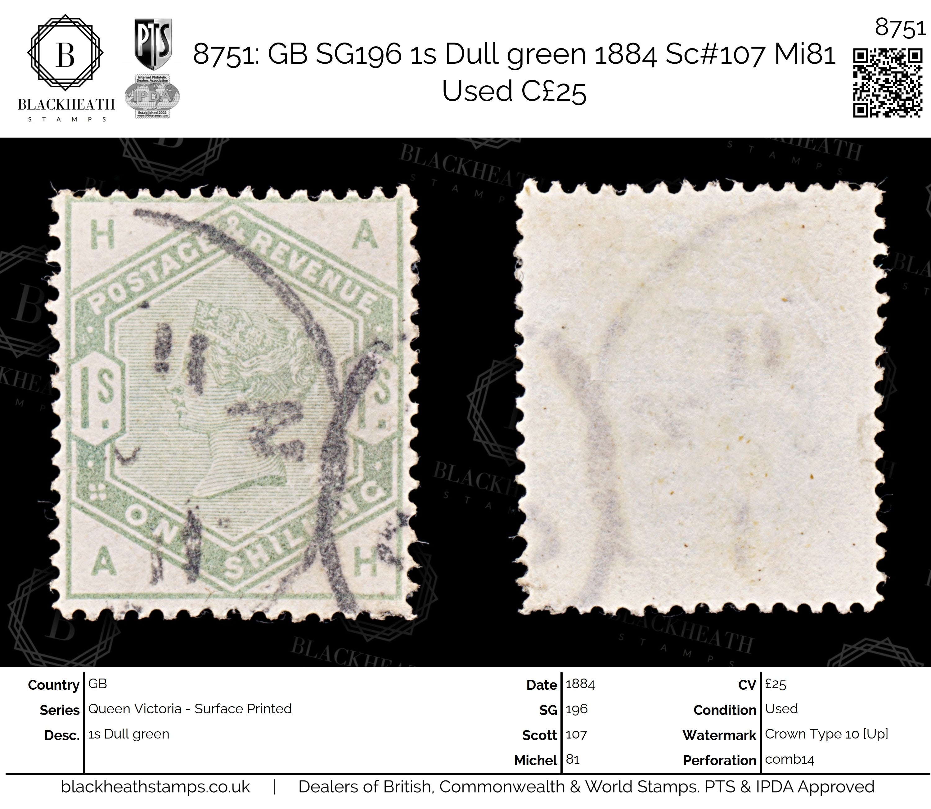 8751: GB SG196 1s Dull green 1884 Sc#107 Mi81 Used C£25