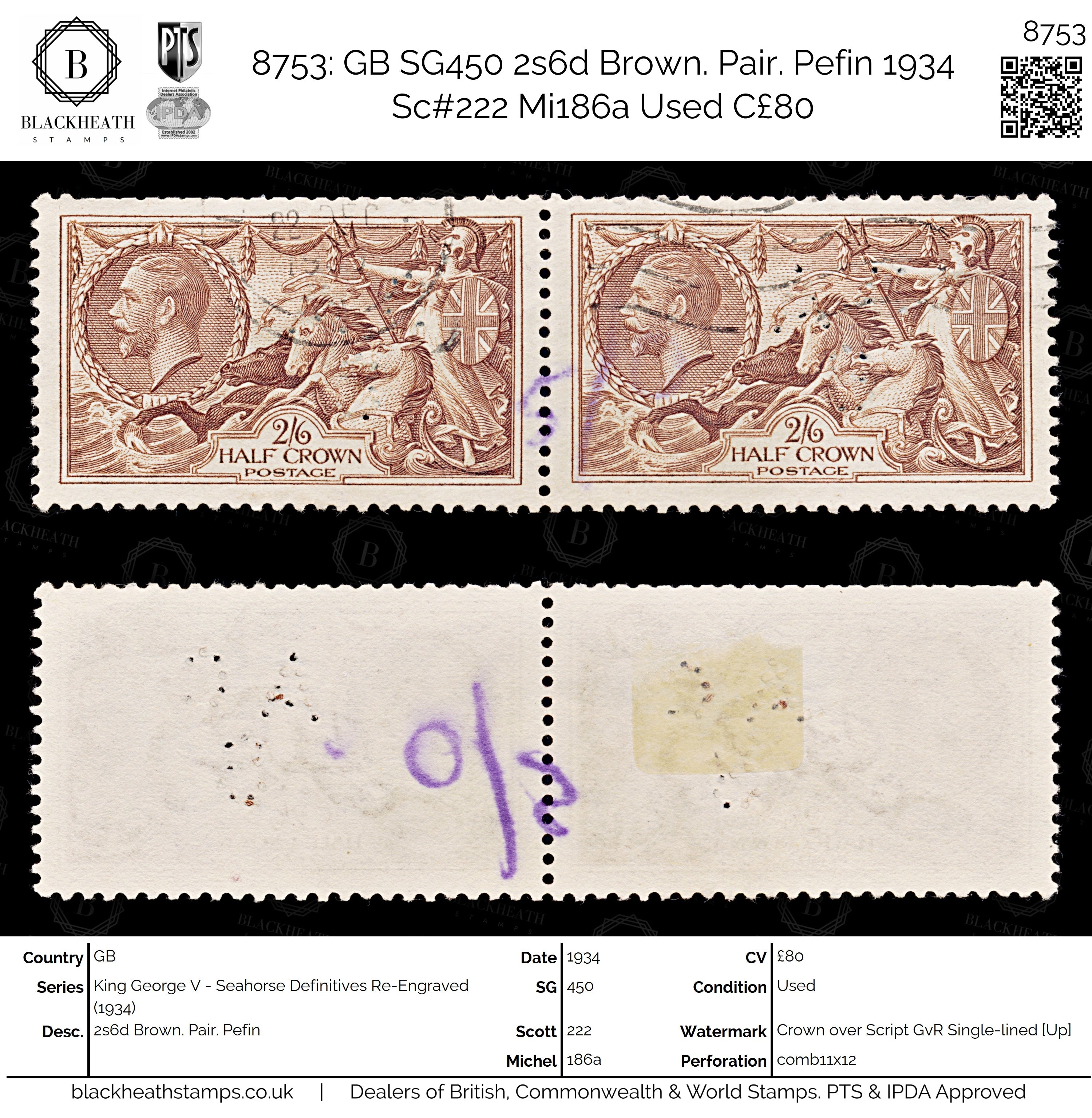 8753: GB SG450 2s6d Brown. Pair. Pefin 1934 Sc#222 Mi186a Uséd C£80