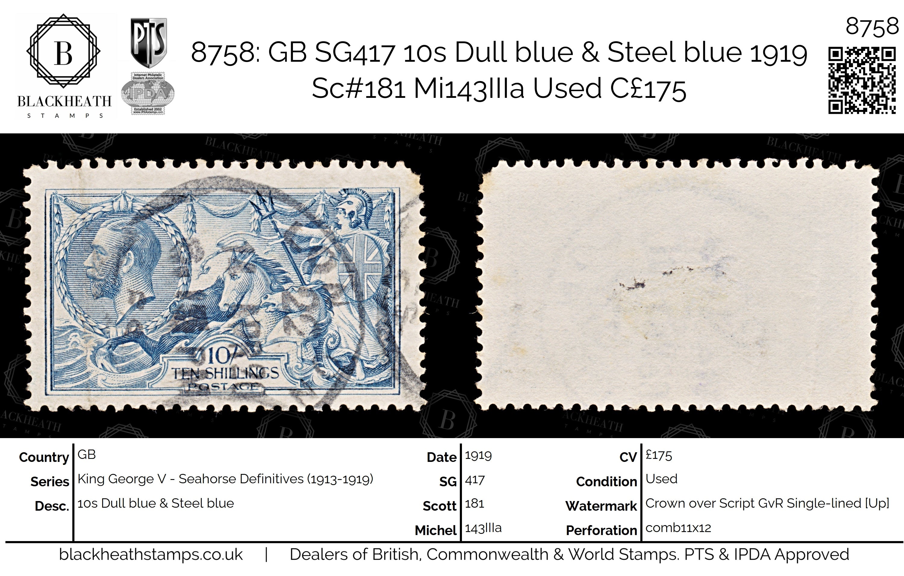 8758: GB SG417 10s Dull blue & Steel blue 1919 Sc#181 Mi143IIIa Uséd C£175