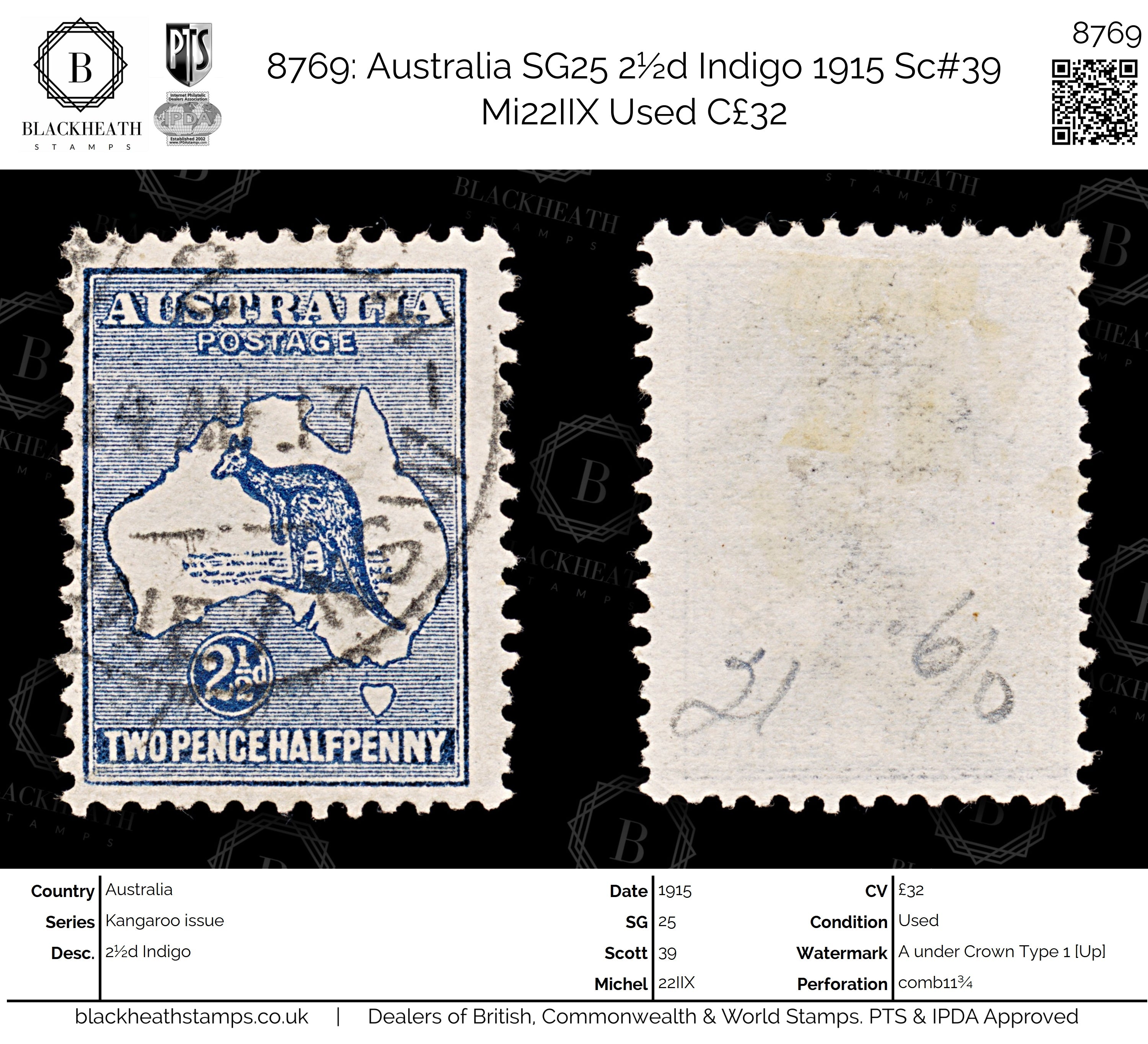 8769: Australia SG25 2½d Indigo 1915 Sc#39 Mi22IIX Uséd C£32