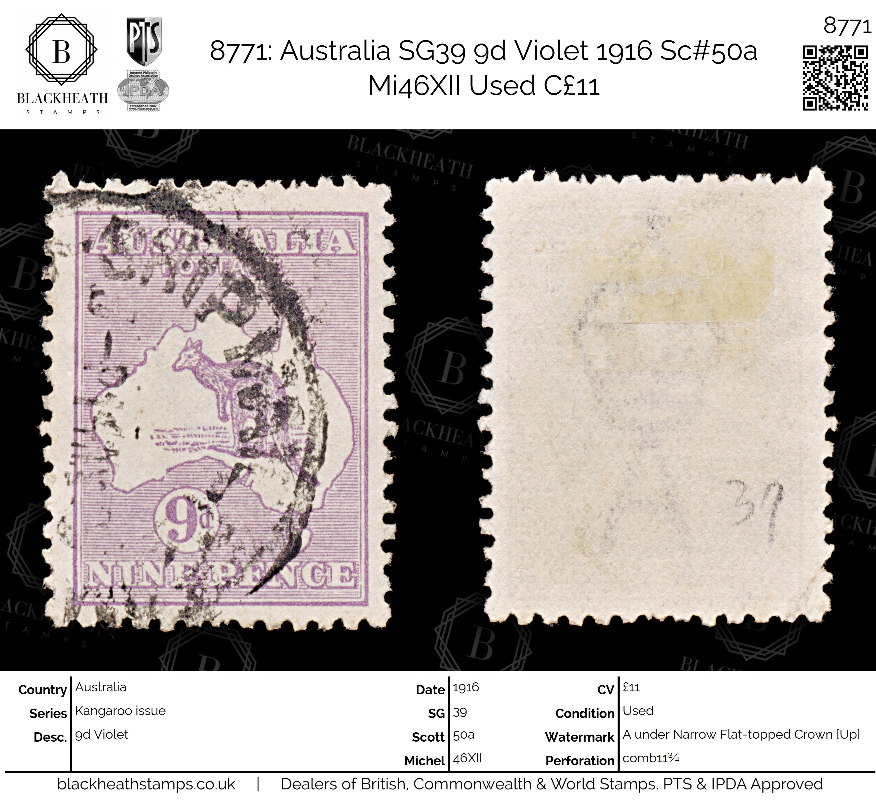 8771: Australia SG39 9d Violet 1916 Sc#50a Mi46XII Uséd C£11